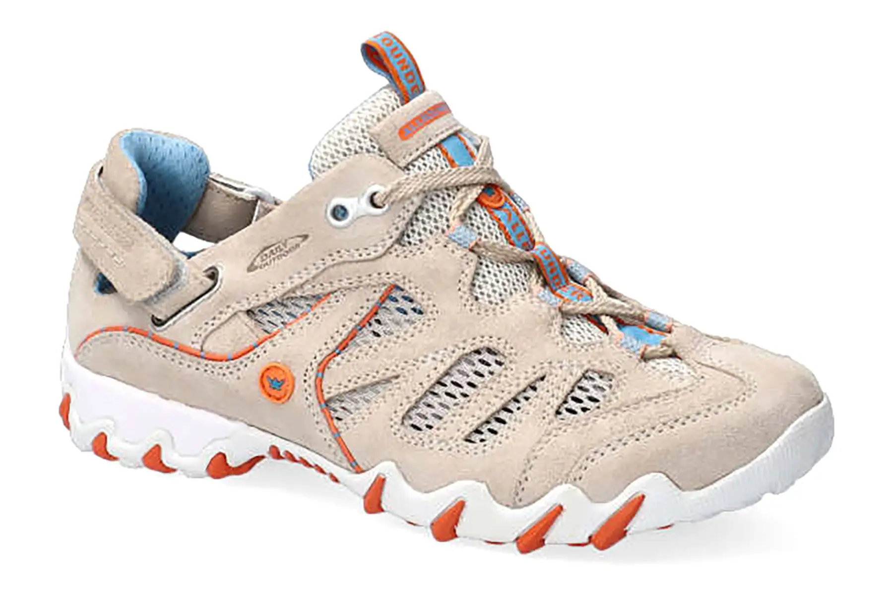 NIWA model from ALLROUNDER: With this shoe you will overcome the challenges of everyday life. The adjustable and self-gripping strap allows a perfect fit and comfort. The quality of the material in beige velvet with touches of orange and blue characterizes the special style of this article. You will love it!