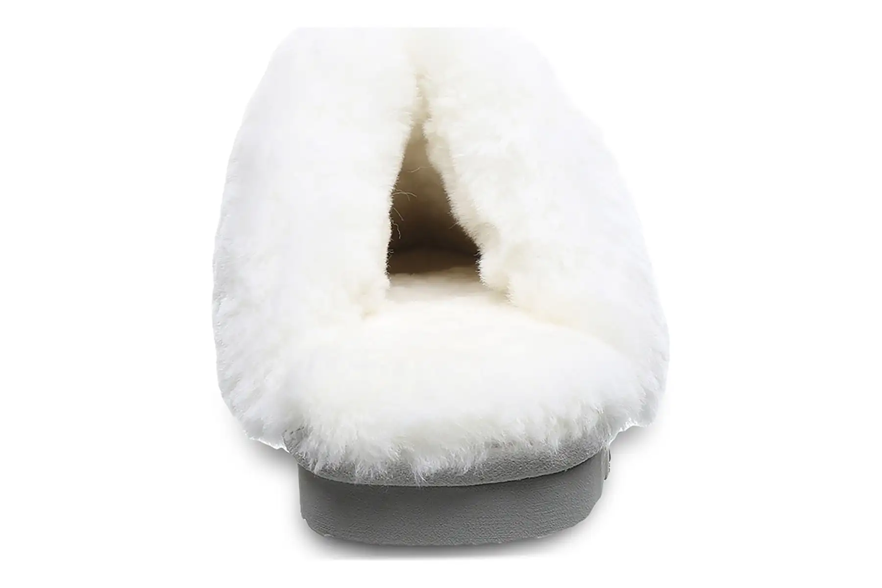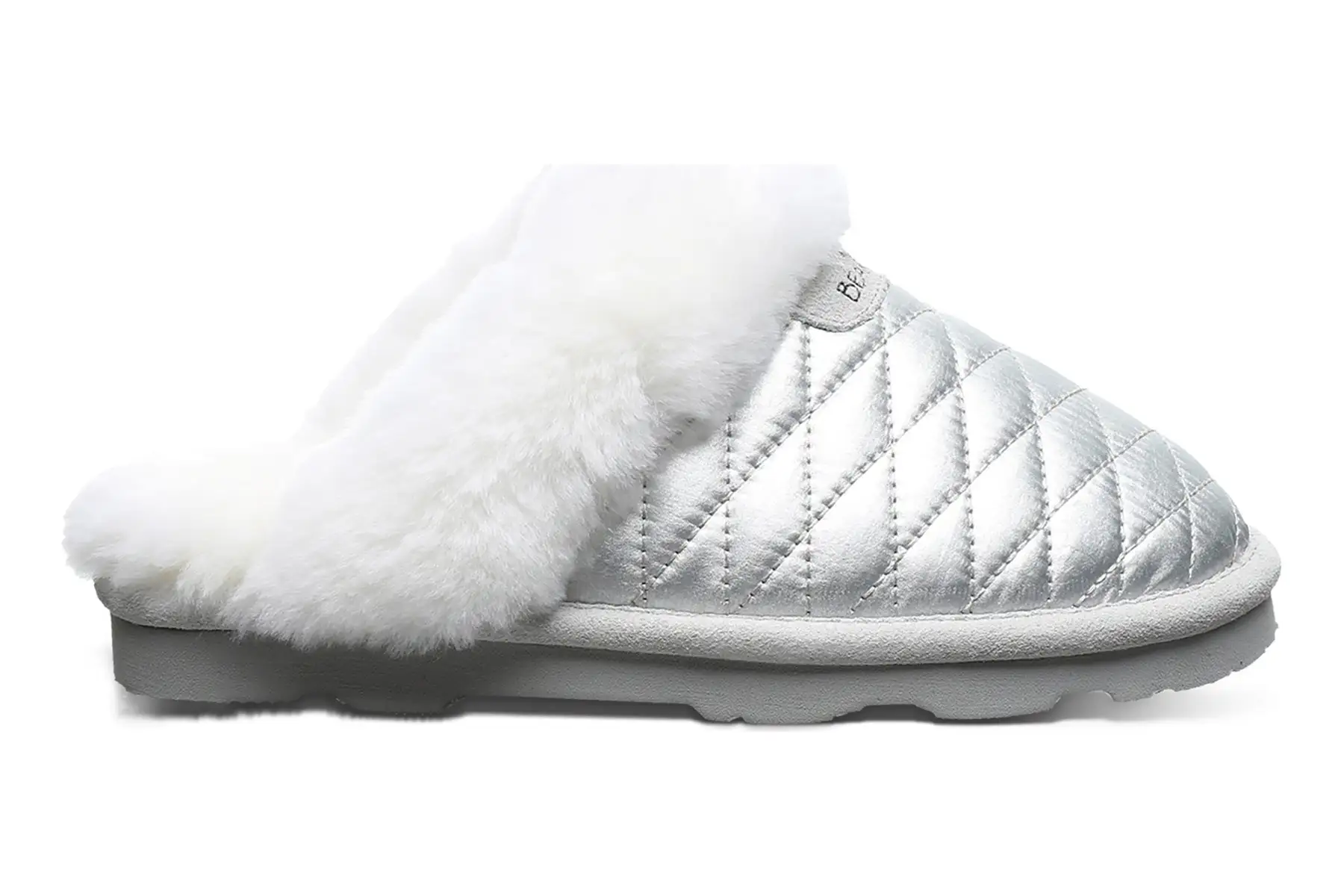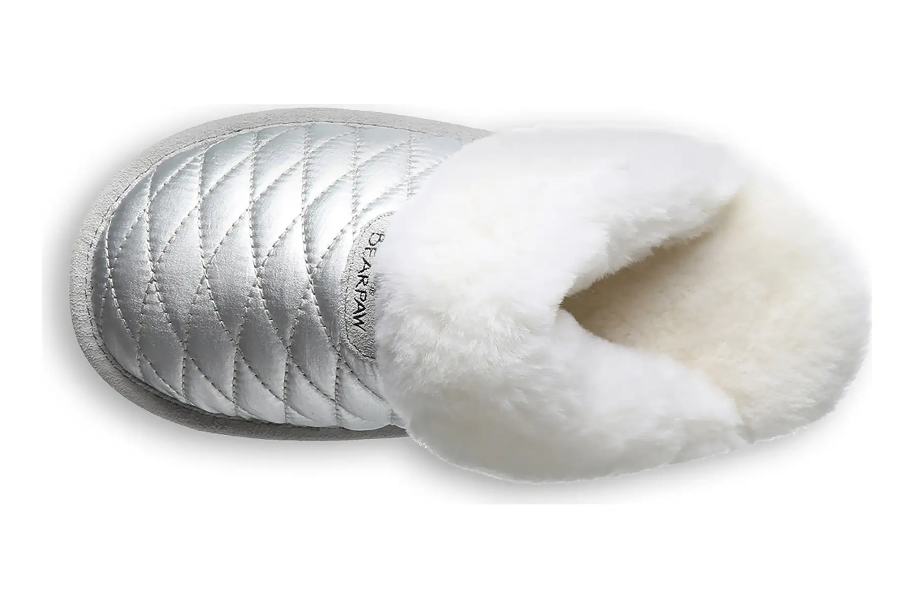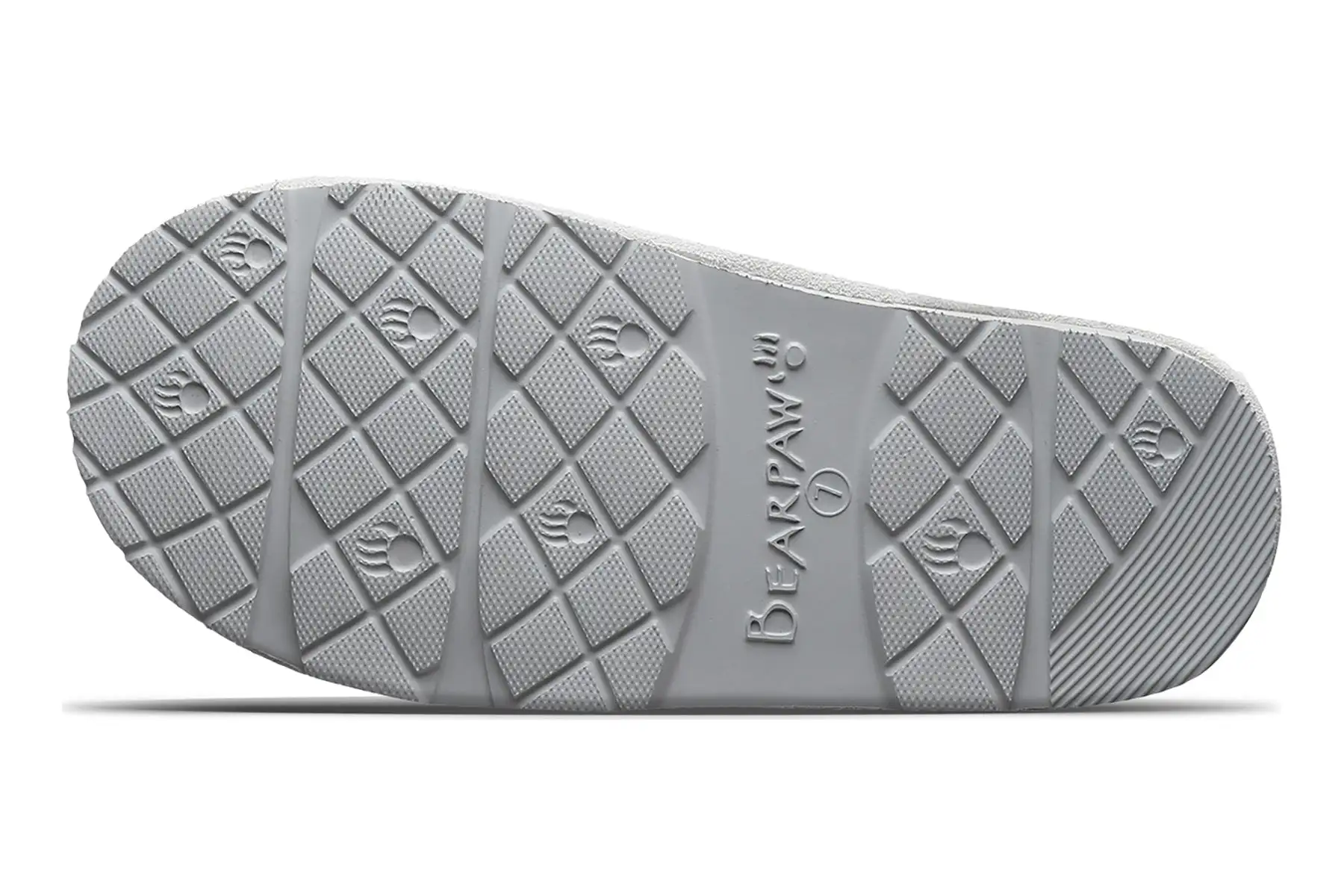 Bearpaw Effie is a snug and cozy women’s slipper. These cold weather shoes have knit or textile uppers, sheepskin collar and lining and a molded EVA outsole. A contoured footbed adds comfort, faux fur provides warmth and durable slip-on construction is long lasting.
