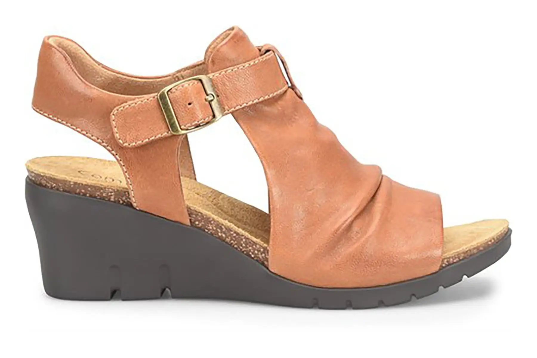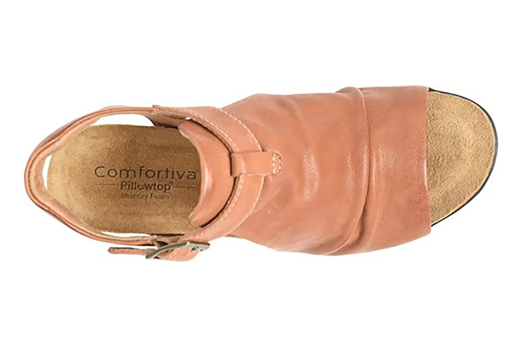 Comfortiva Arrosa is a trendy and comfortable wedge sandal. Features include leather uppers, memory foam footbed and a sturdy TPR wedge with a 2 ¼ inch heel. An open round toe, ruched leather construction and adjustable buckle strap at the ankle completes these beautiful wedges.