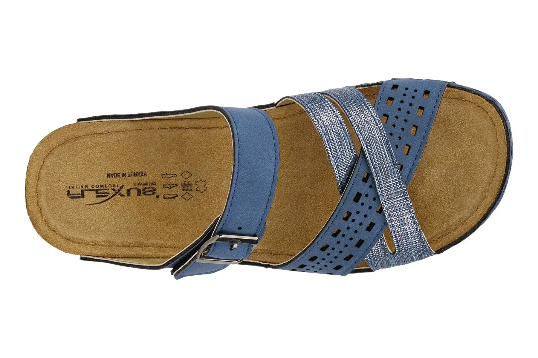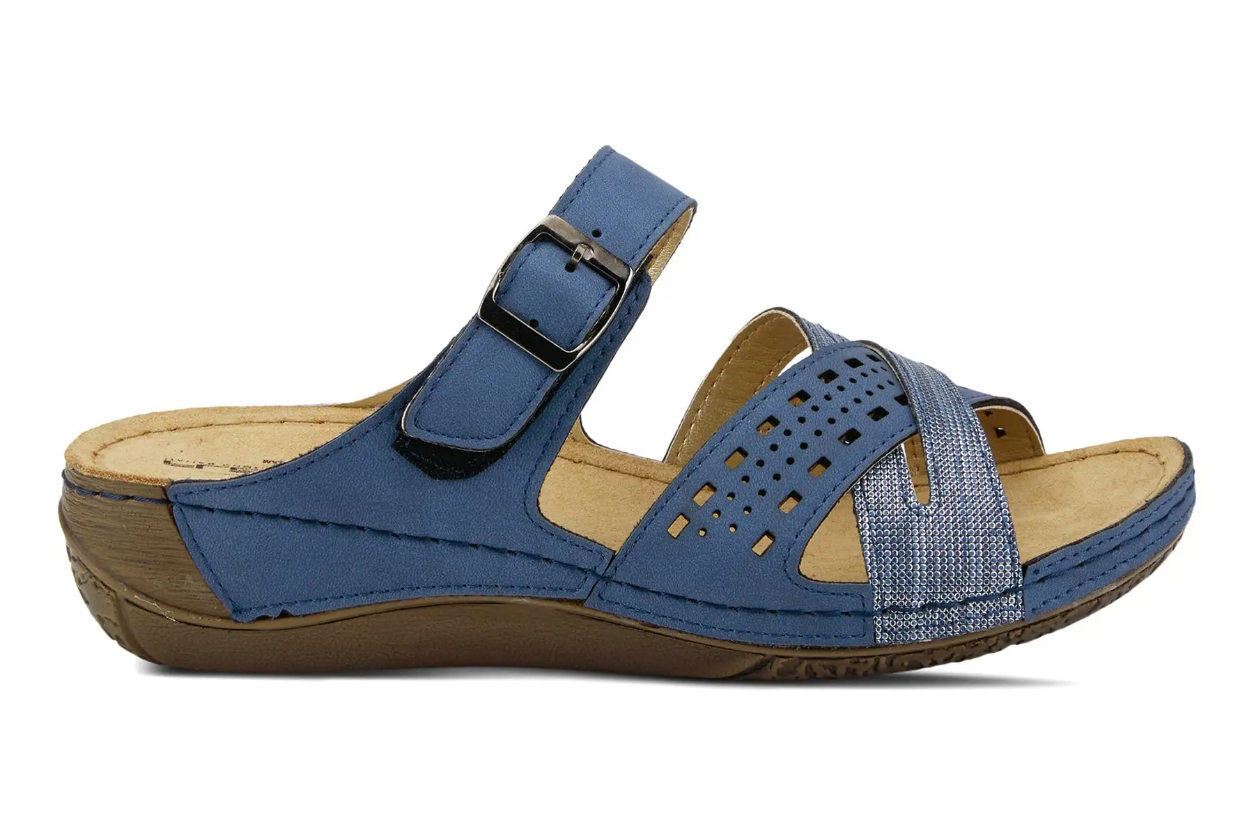 Two tone and textured slide with adjustable hook & loop fastening and shiny metal buckle detail, featuring cross over straps with cut outs, all on a polyurethane wedge outsole with heavy stitch detail.