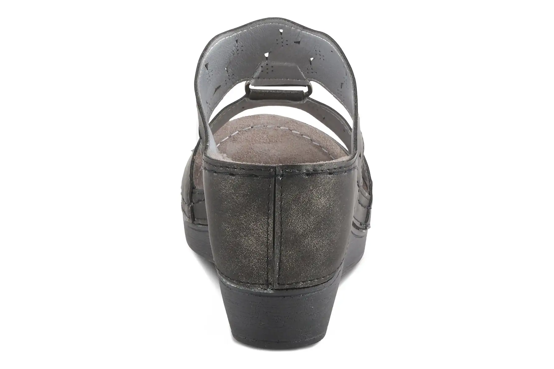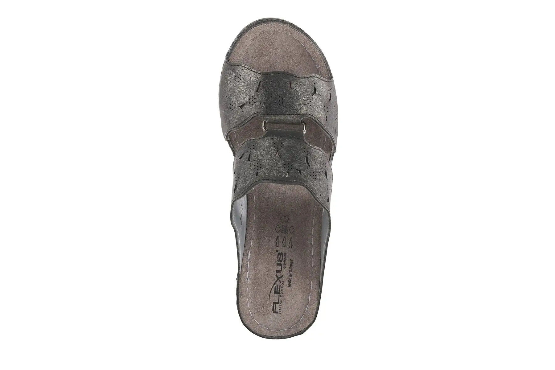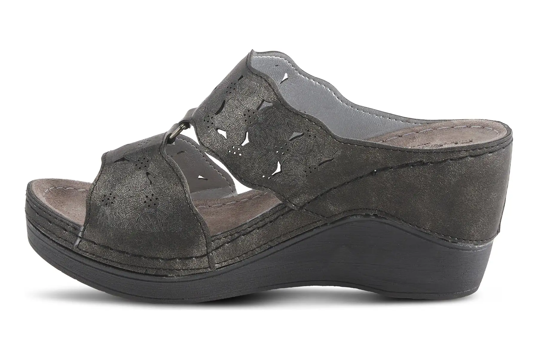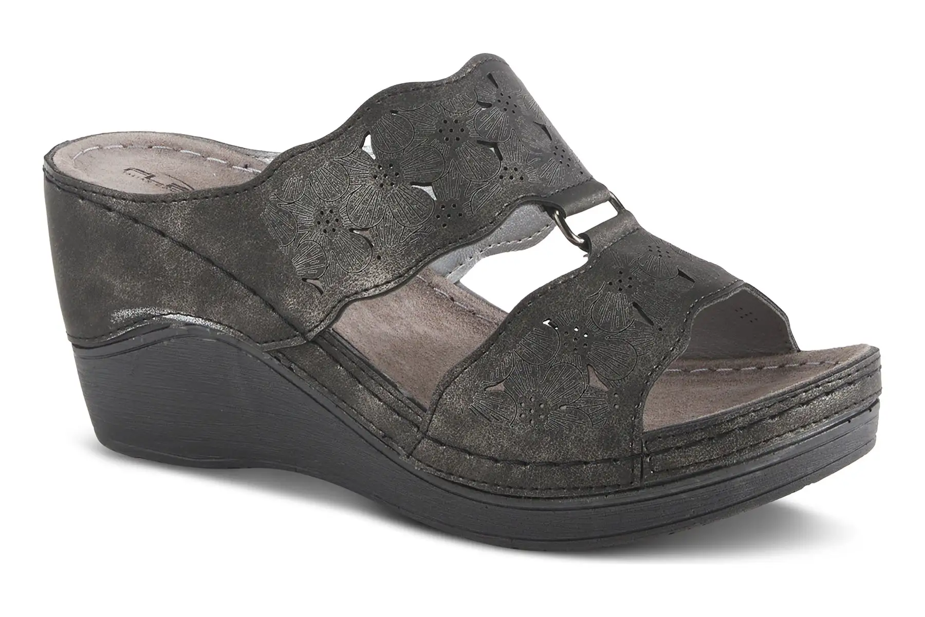 Double strapped wedge slide sandal with a connecting loop and geometric perforations