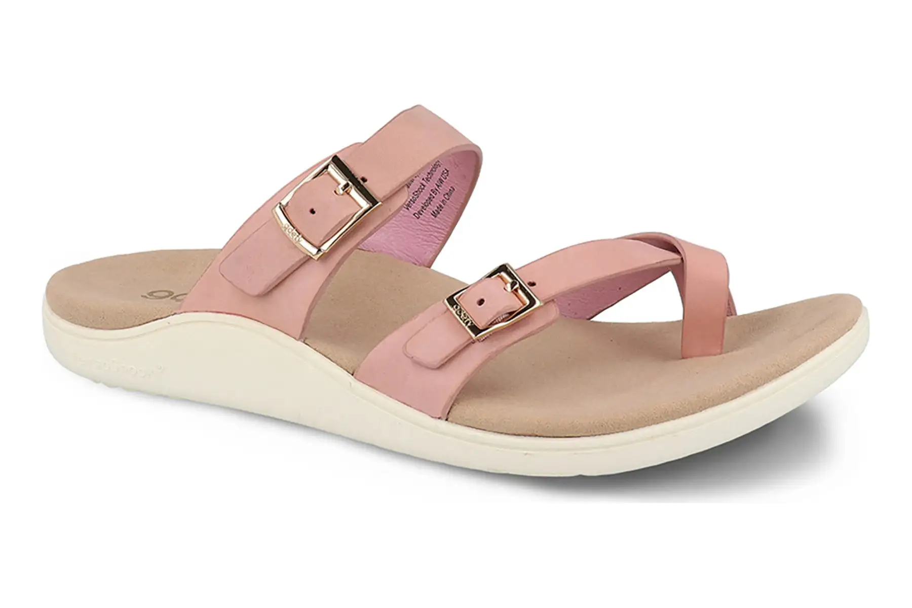 GDEFY Yontal is a durable and comfortable toe post sandal. This crisscross design has leather uppers, adjustable buckles and straps and built-in orthotics. Our Versoshock® technology absorbs shock, while an outdoor tread pattern outsole adds traction and stability.