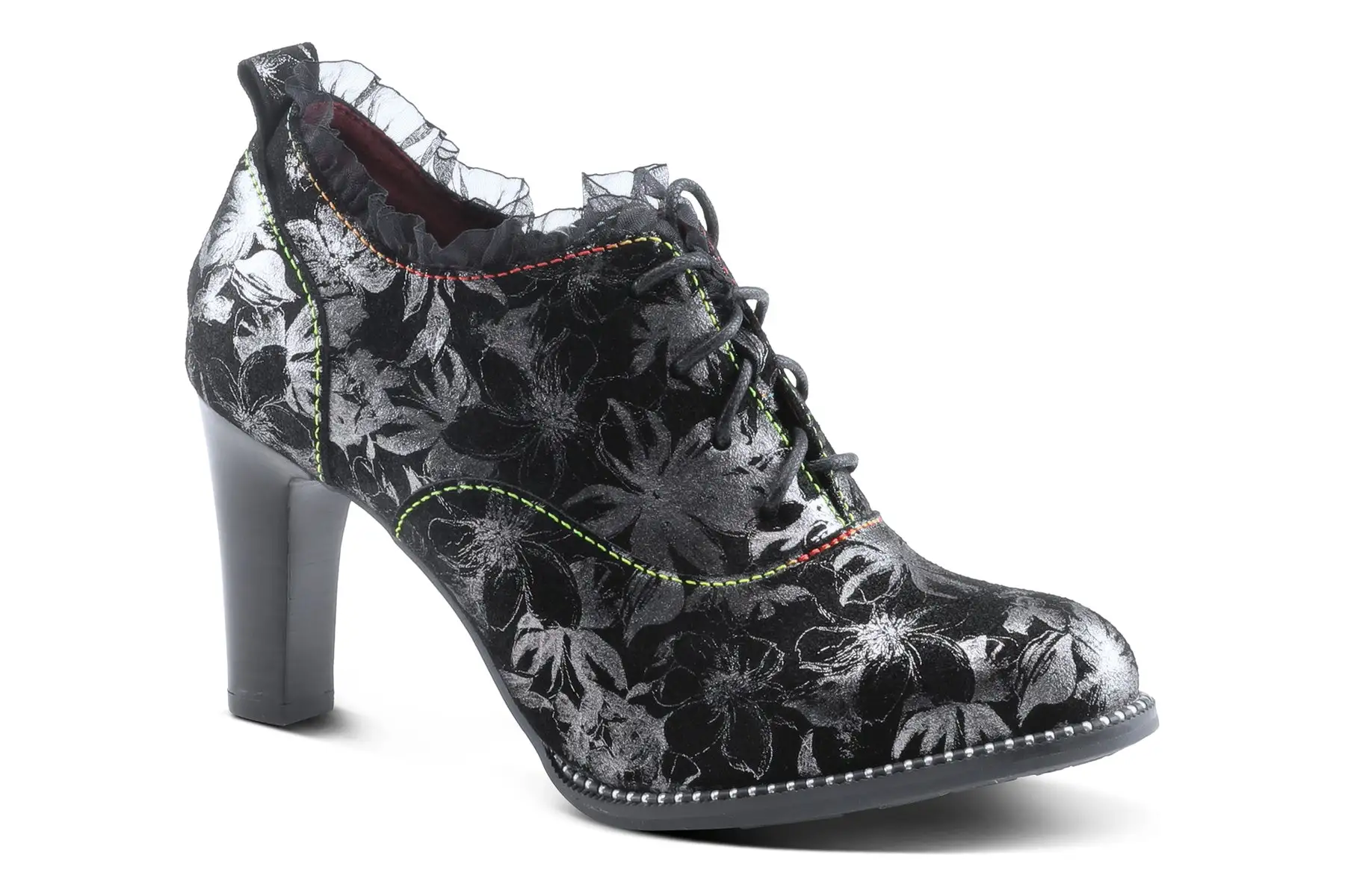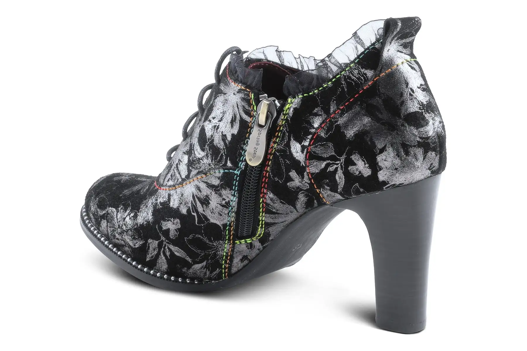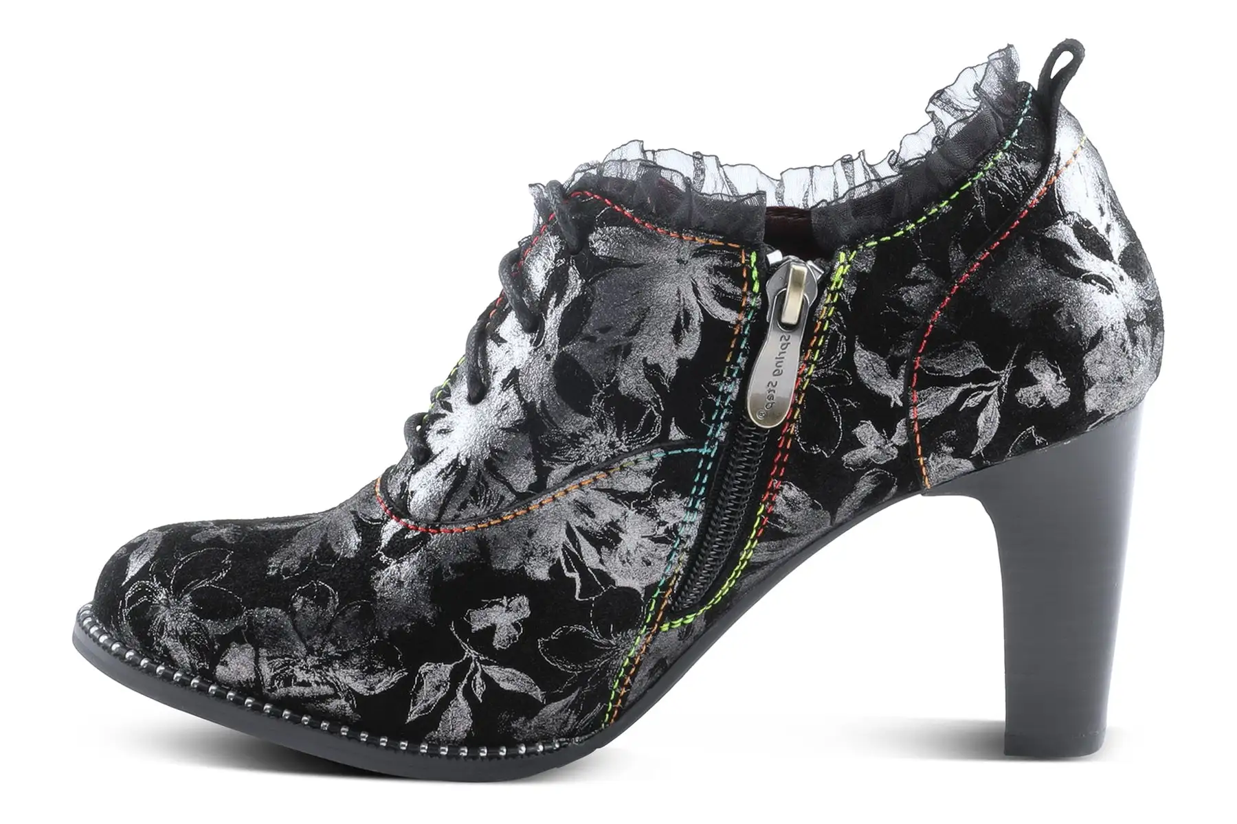 L`Artiste Style: Glitzish -Unique printed genuine suede shootie with feminine pleated tulle design, an inside zipper and Lace-up closure for adjustability and easy on and off on an elegant stacked heel, and bracelet inspired welt design.