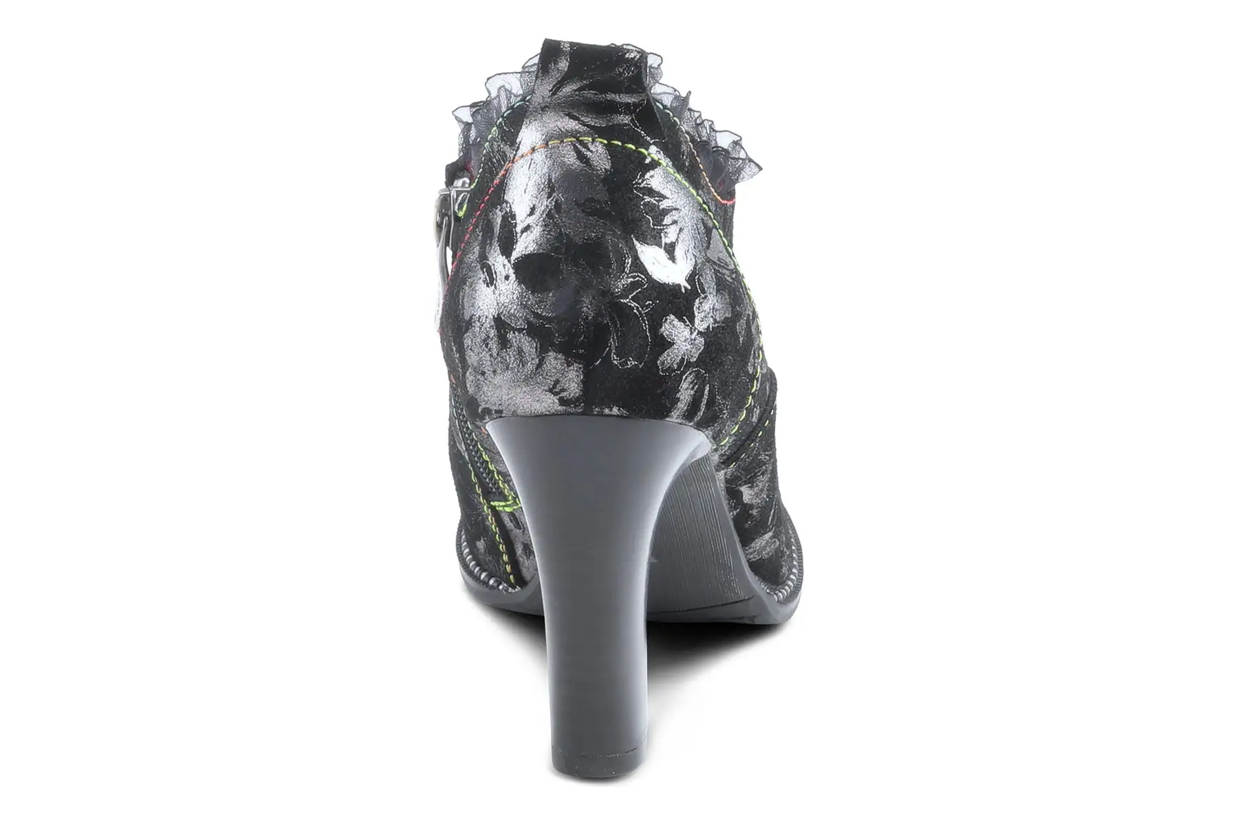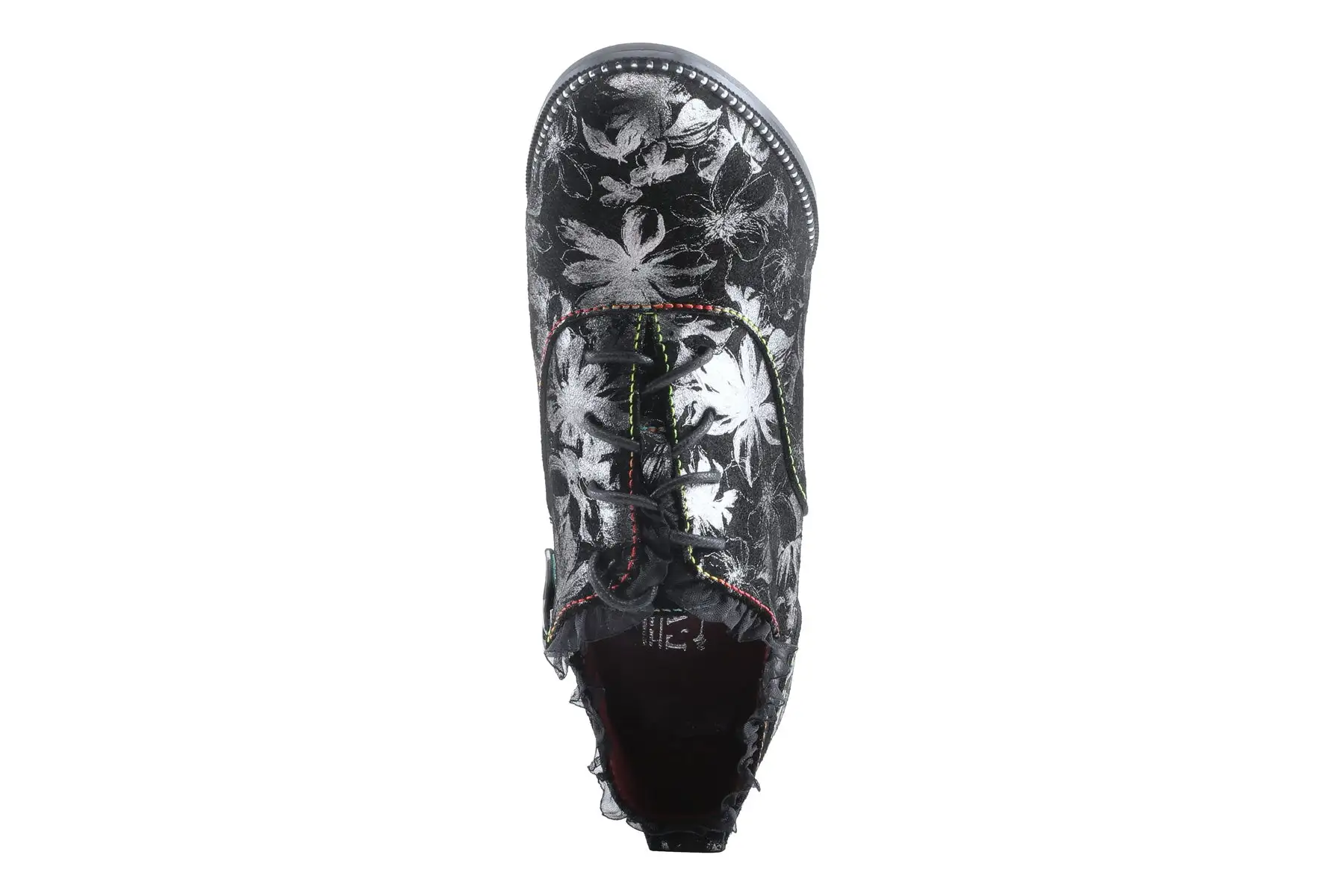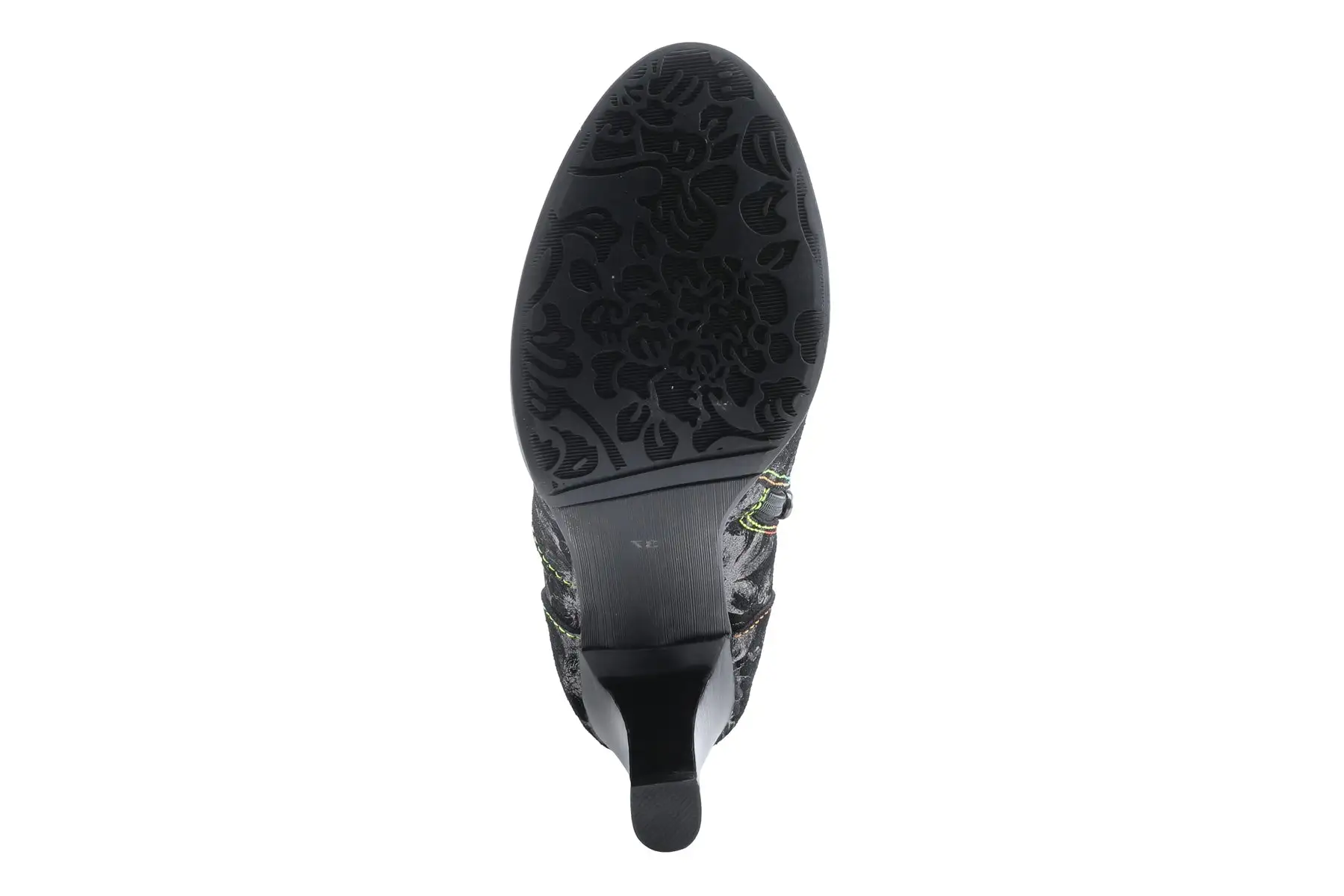 L`Artiste Style: Glitzish -Unique printed genuine suede shootie with feminine pleated tulle design, an inside zipper and Lace-up closure for adjustability and easy on and off on an elegant stacked heel, and bracelet inspired welt design.