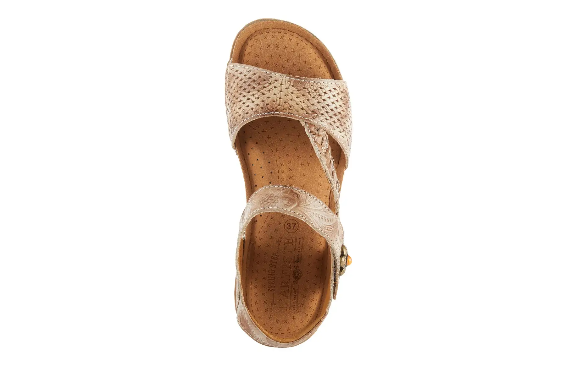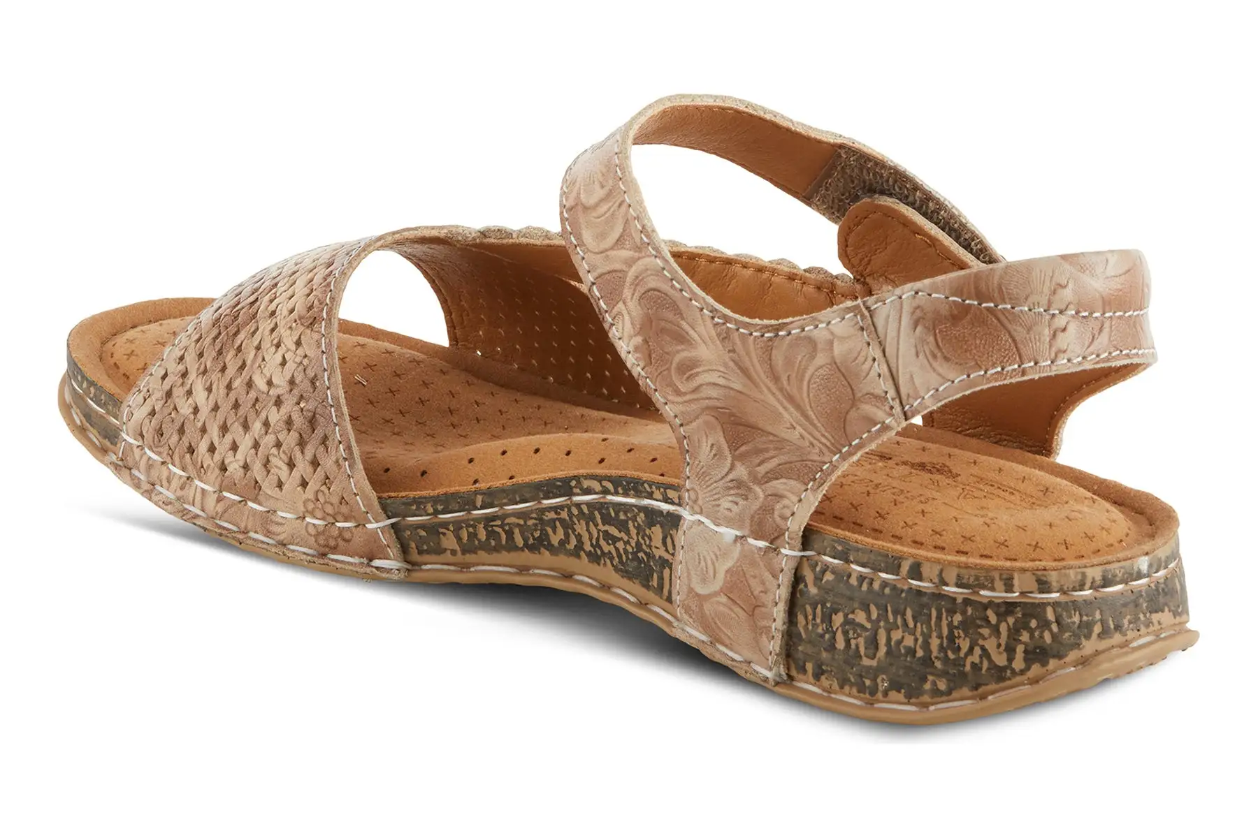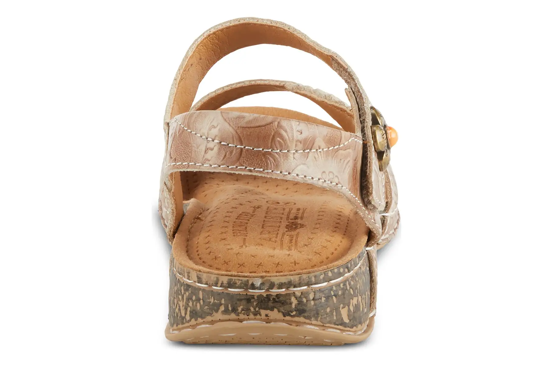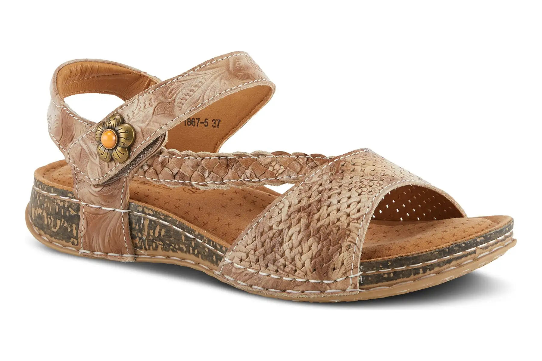 This corked sandal has a double hook-and-loop paired with an antiqued metal embossed flower for fashionable leisure. This asymmetrical braided side strap and the back strap hugs your foot and gives you all-day support.