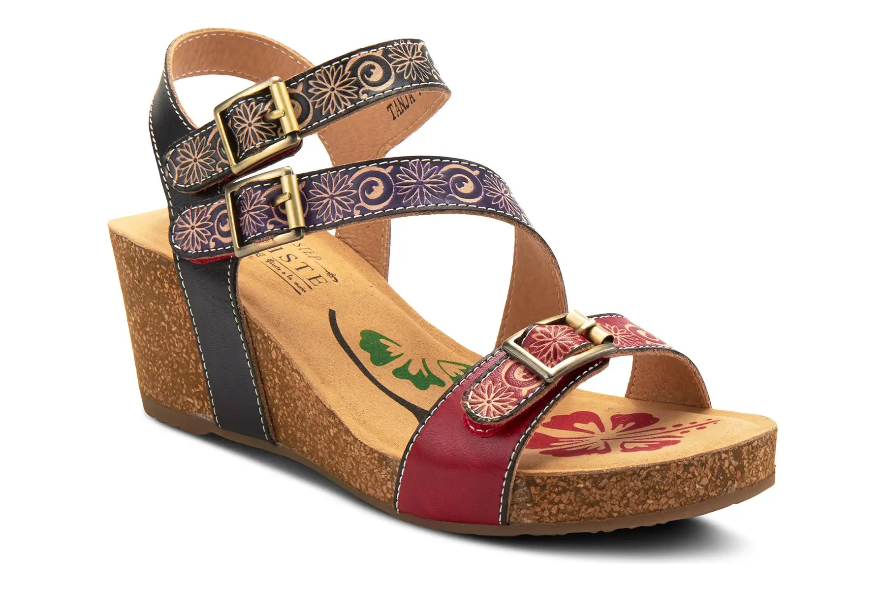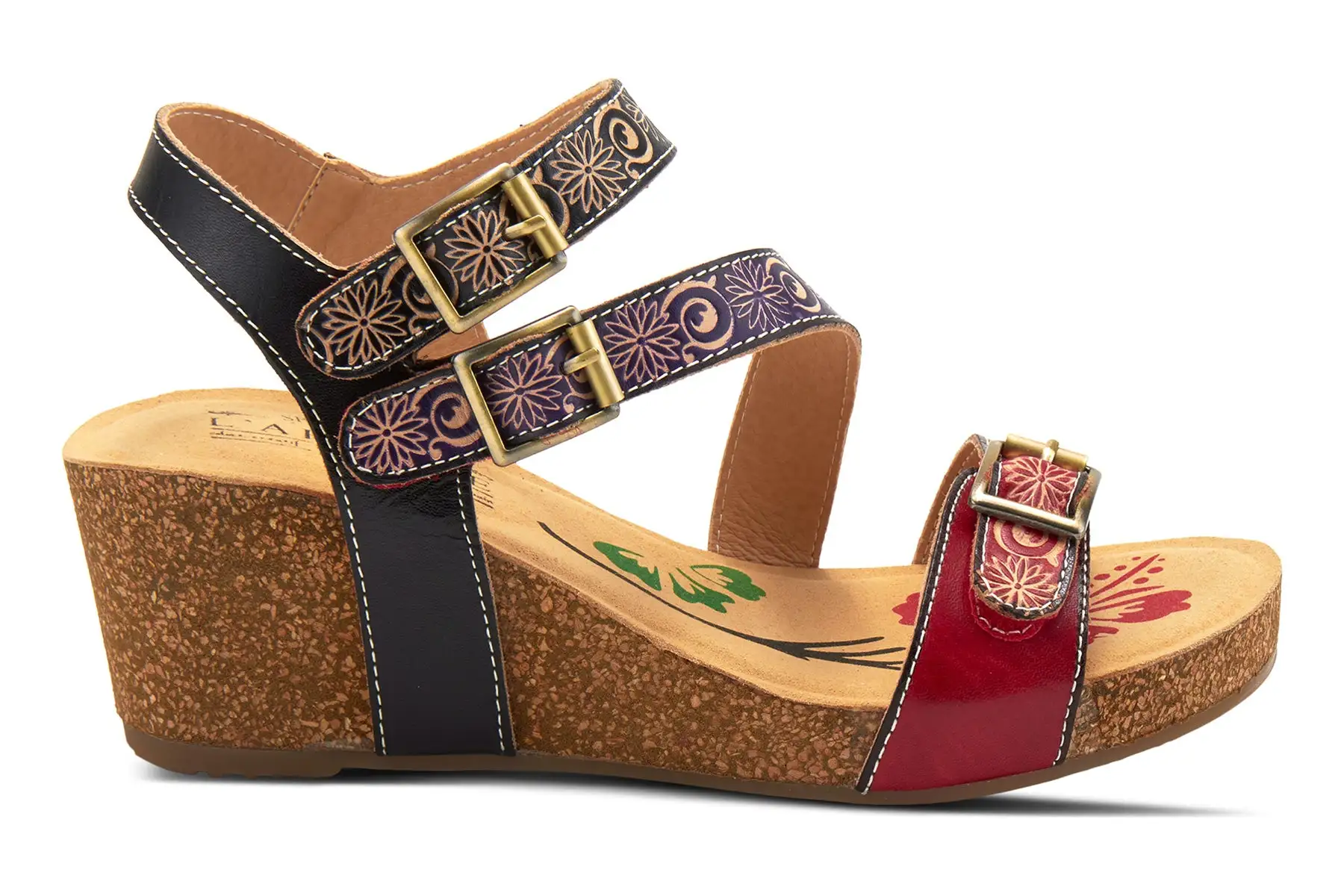 French-inspired, beautiful hand-painted premium leather asymmetrical quarter strap sandal featuring a floral embossed pattern, tonal stitchwork, and three (3) adjustable hook and loop straps all on a cork-infused, comfort wedge with a platform.