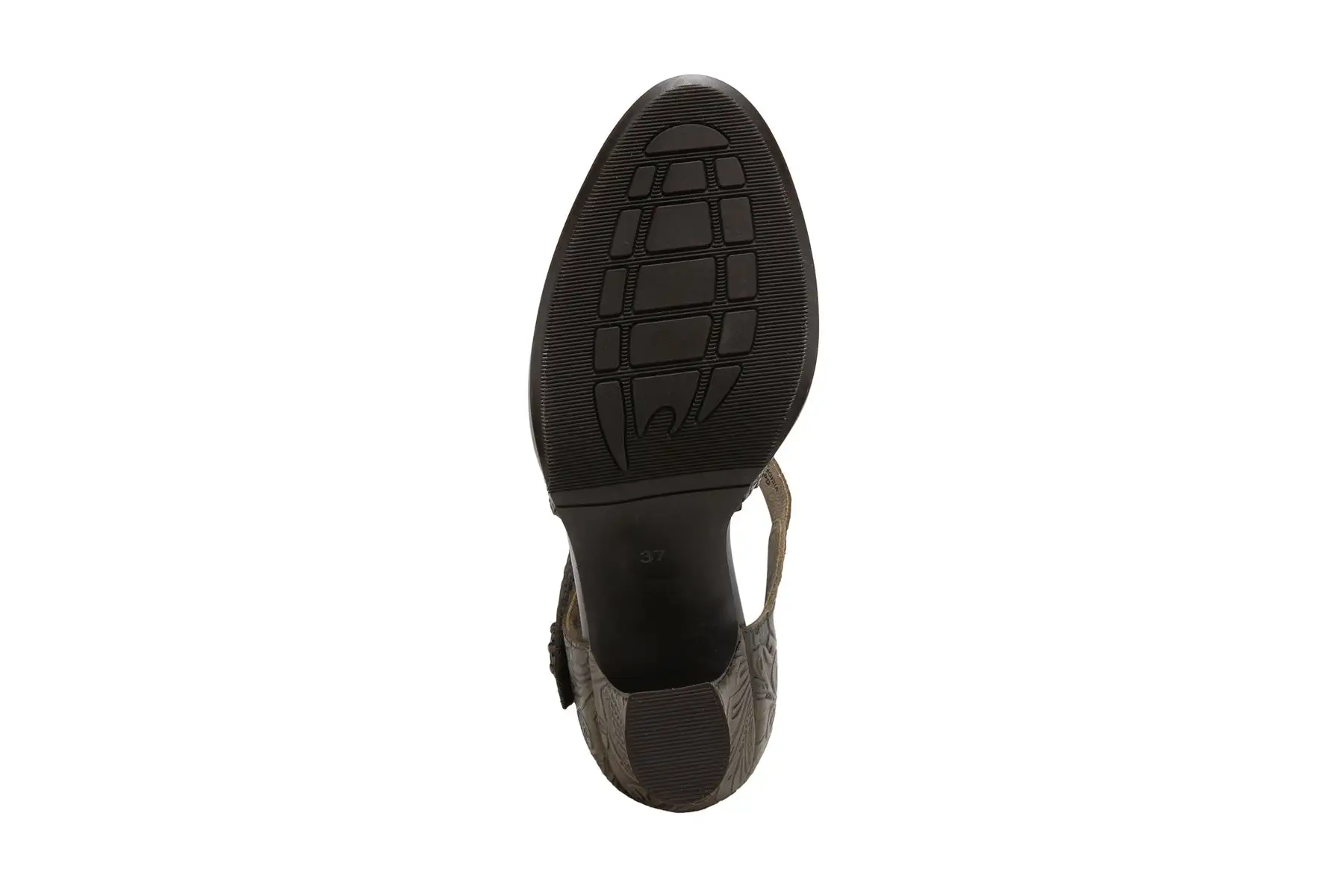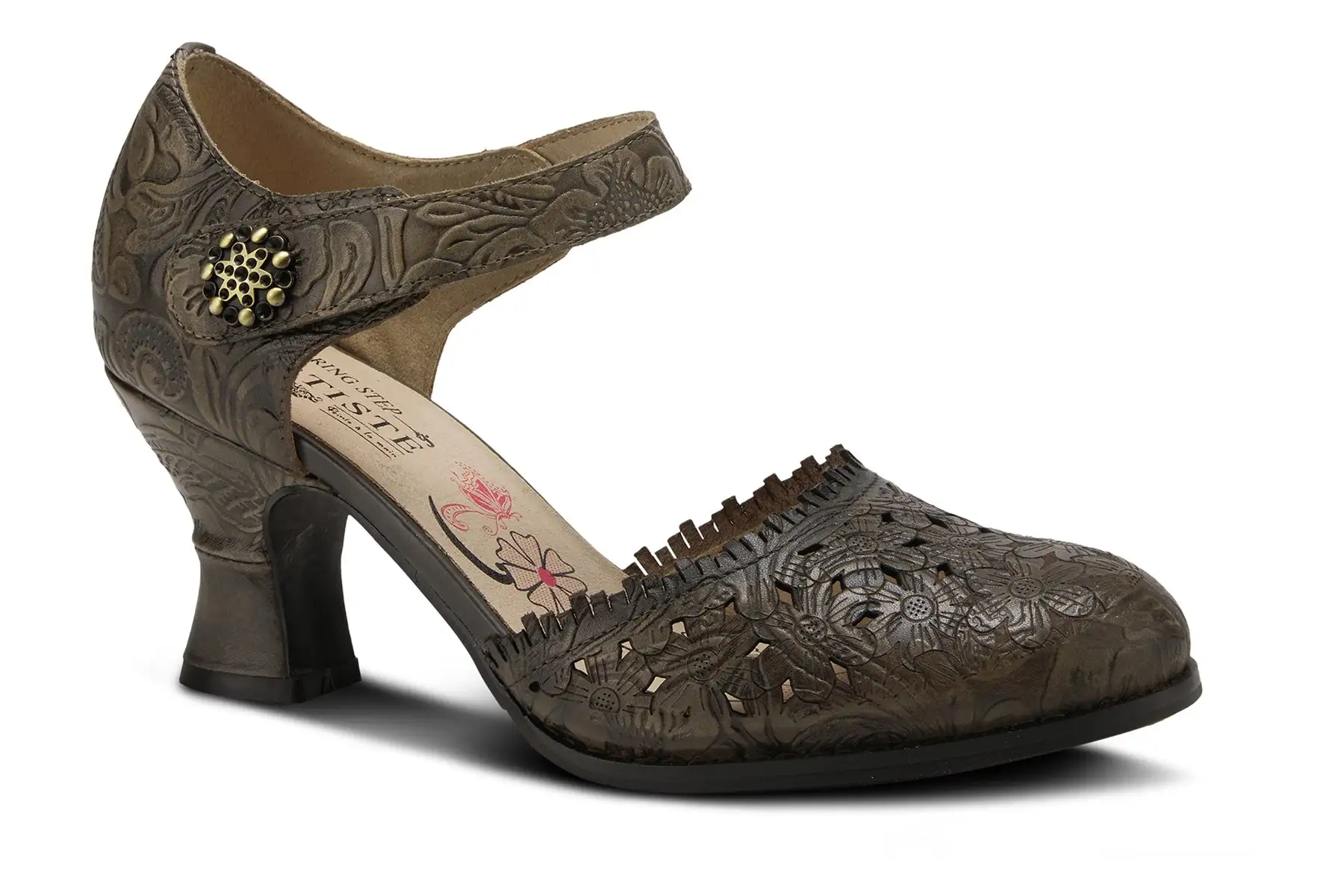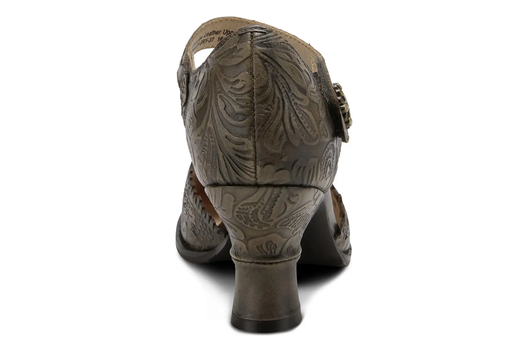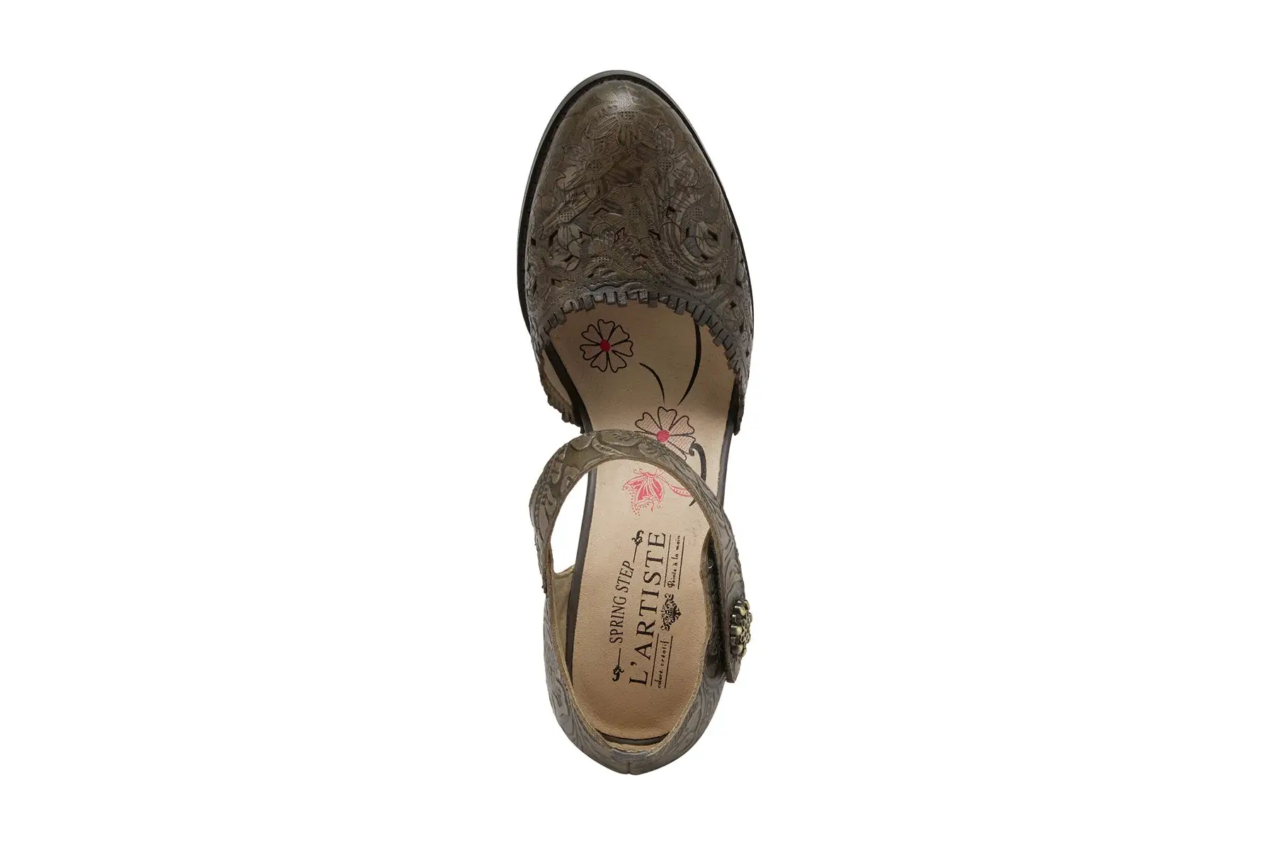 French-inspired, beautiful hand-painted leather D`orsay shoe featuring dainty foliage embossed pattern, floral laser etching, and cutout design, and an adjustable hook and loop ankle strap with a decorative brushed metal ornament all on a rainbow-threaded espadrille-wrapped, comfort wedge with a platform.