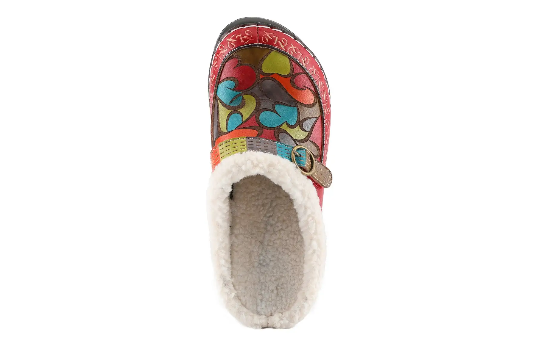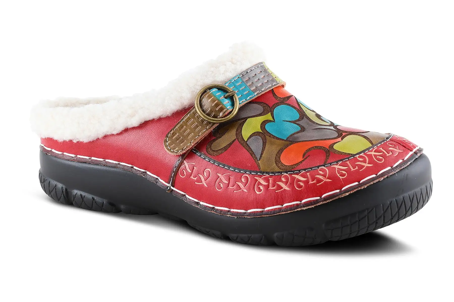 L`Artiste YALLA Vibrant indoor/outdoor leather slipper featuring an explosion of color with laser etching and embossed design trimmed and lined with sherpa-like lining on comfort outsole.