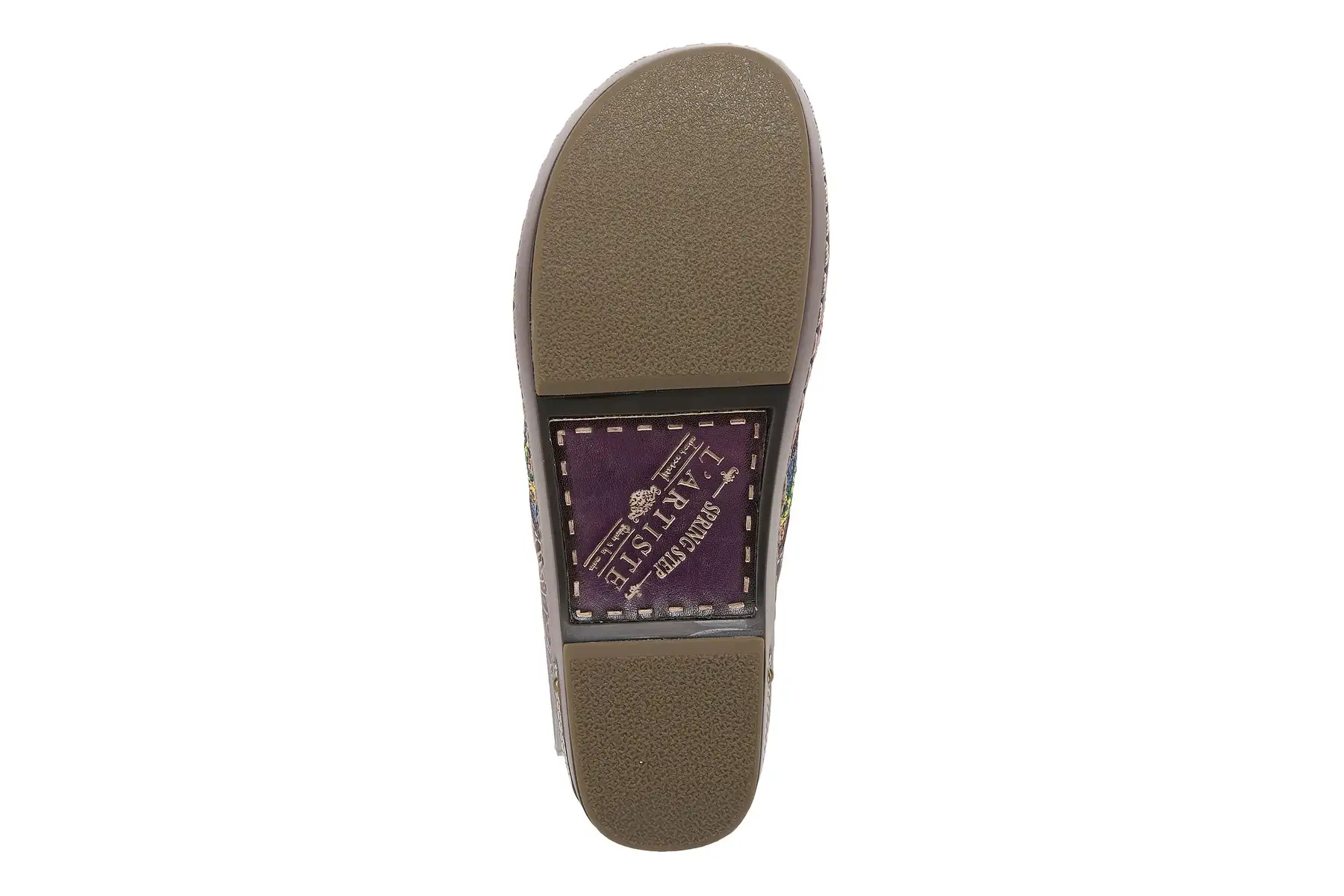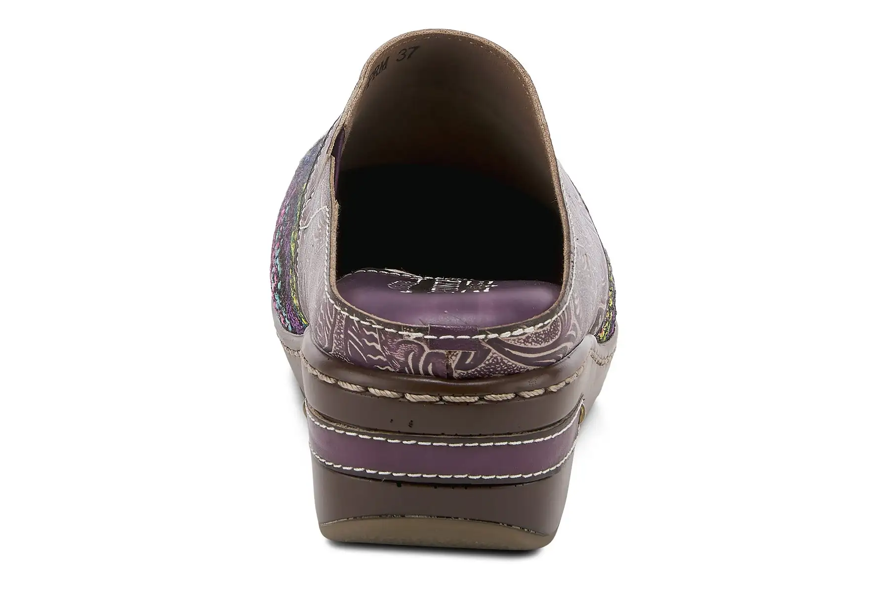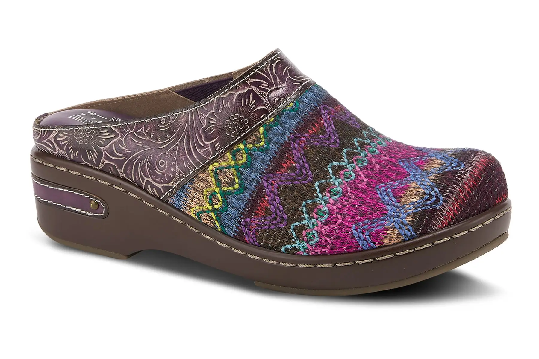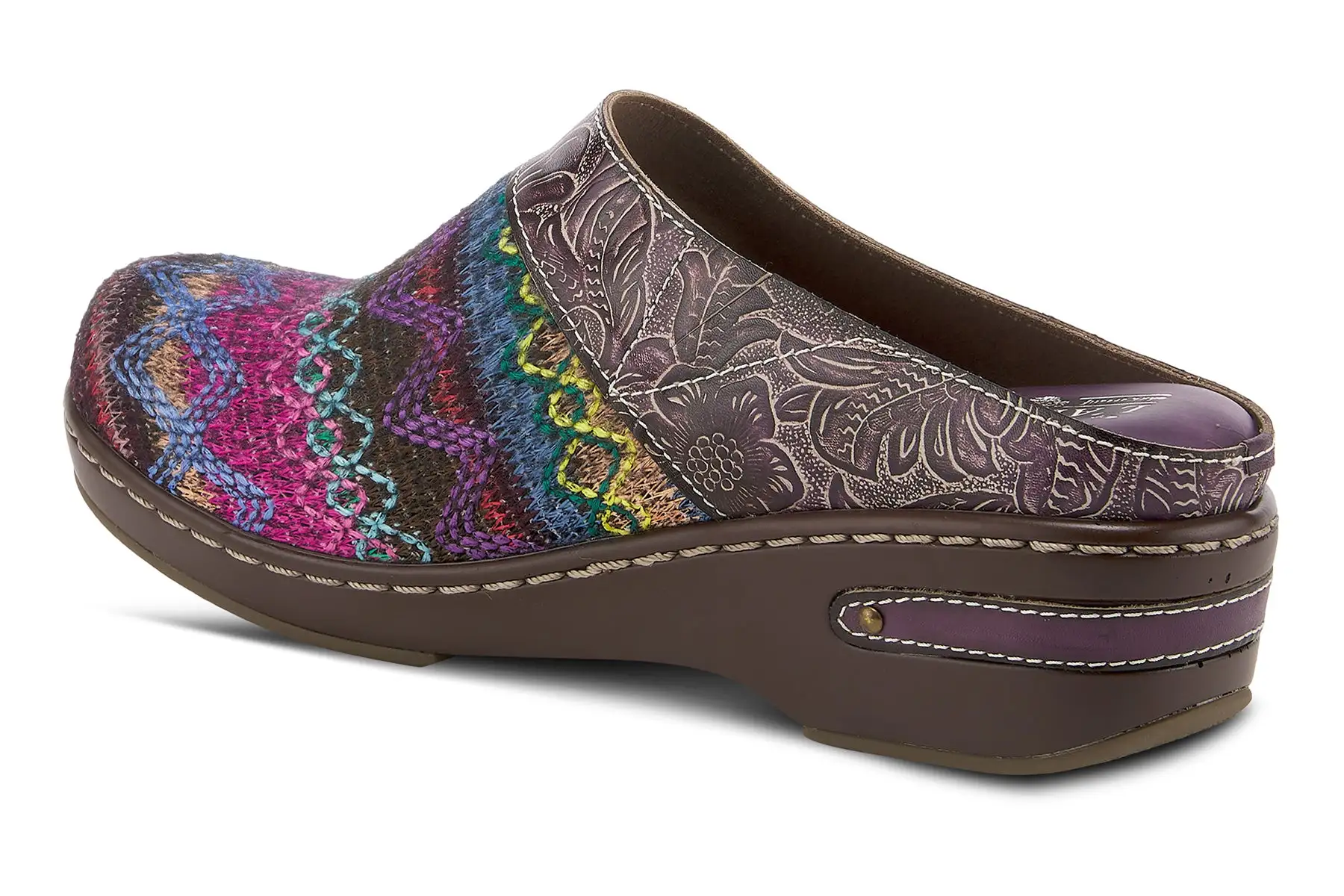 L`Artiste ZIGINO Fashionable backless leather combo clog with gorgeous woven textile and debossed floral leather on an incredibly comfortable outsole.
