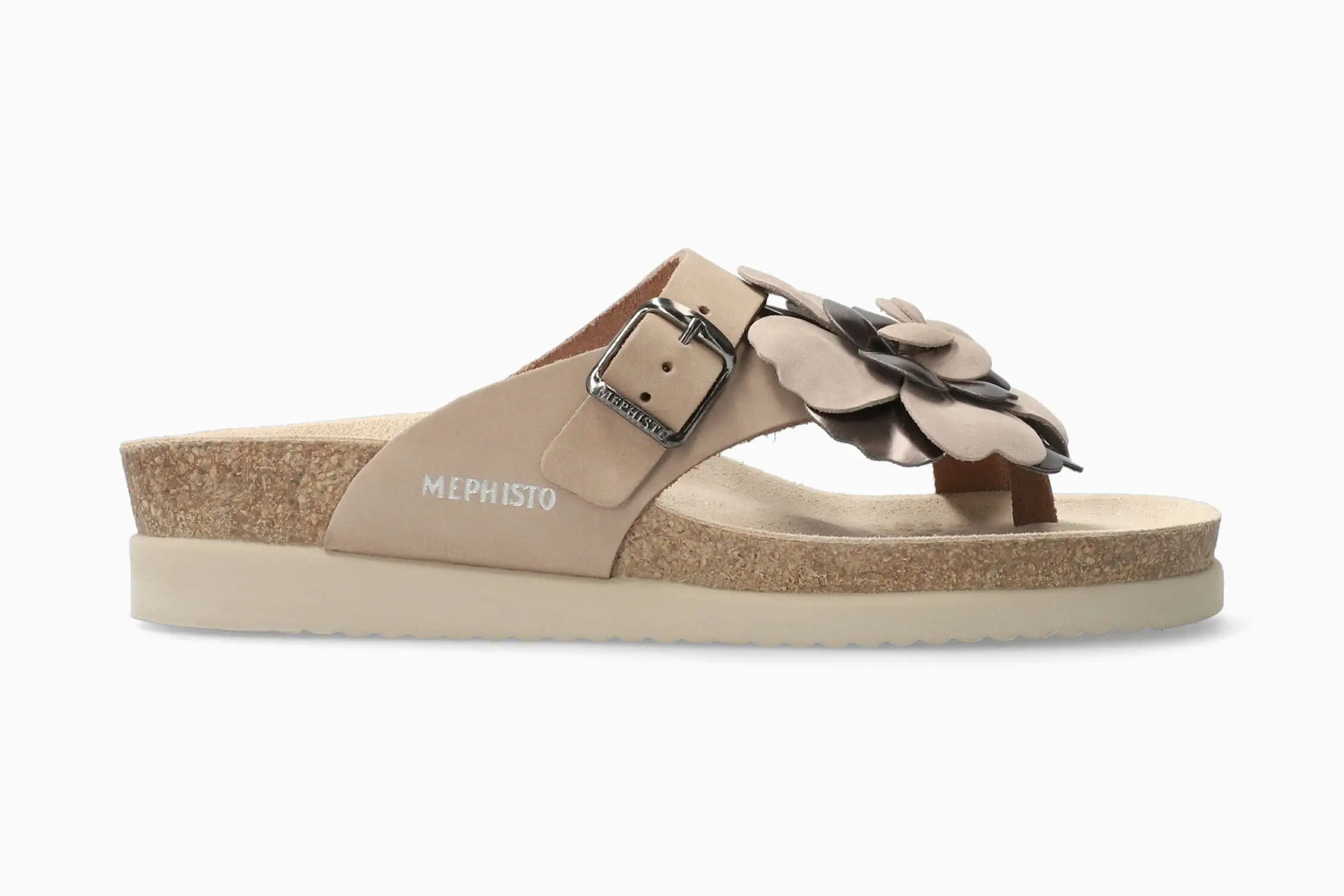 MEPHISTO HELEN FLOWER – Women Cork Sandals Leather Nubuck. This ladies’ lightweight toe post sandal is a must for a relaxed summer. It will win you over with its two-tone floral appliqué. The unique SOFT-AIR technology, integrated in the cork midsole, guarantees an effortless walk. The AIR-RELAX technology respects the anatomy of the foot to prevent fallen arches. Adjustable strap with buckle fastening.