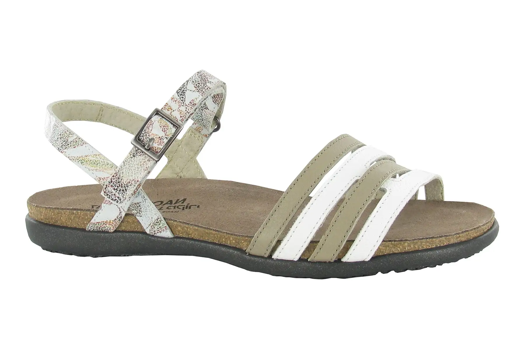 The Lucy is the perfect everyday strappy sandal. Featuring a hook & loop ankle strap for adjustability. Naot’s anatomic cork & latex footbed is wrapped in pampering suede and molds to the shape of the foot with wear. The Flat Elegant Collection features a .75″ TPR sole.