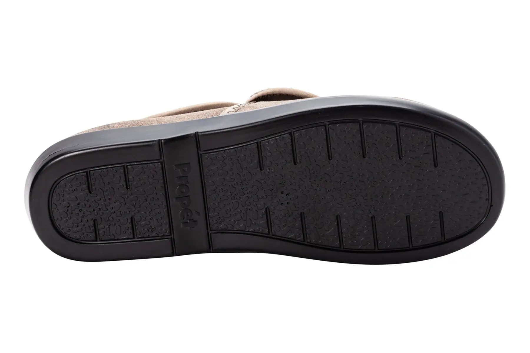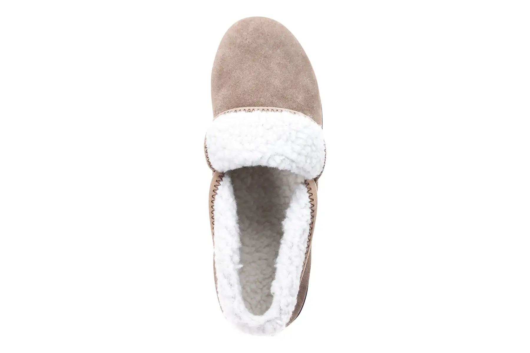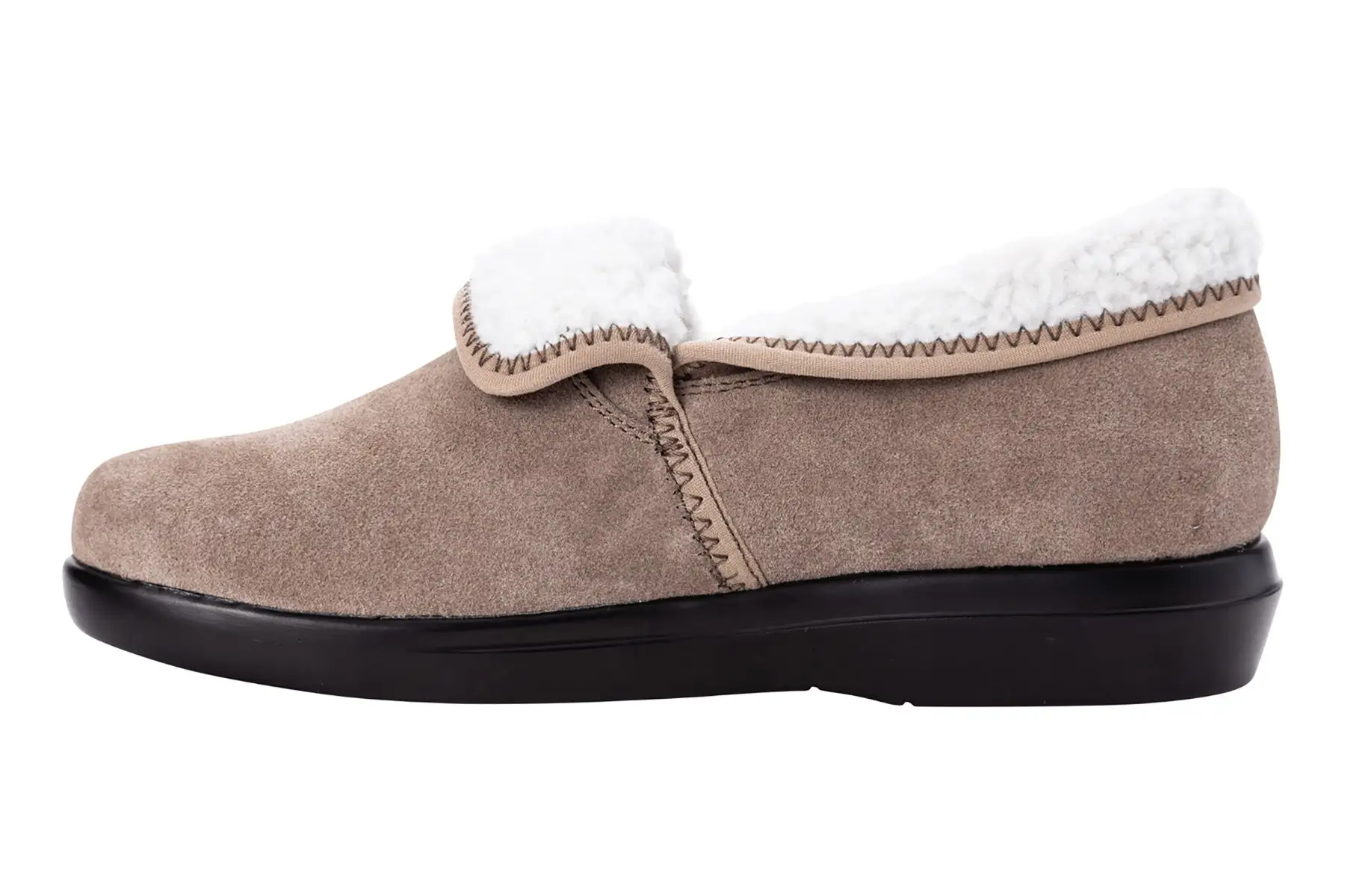 Propet Colbie is a warm and roomy slipper. Features include a suede upper with faux fur lining, slip-on construction, removable footbed and PU outsole. A high density PU foam ensures a cooler footbed, while the warm faux fur trim keeps feet warm during cold weather days.