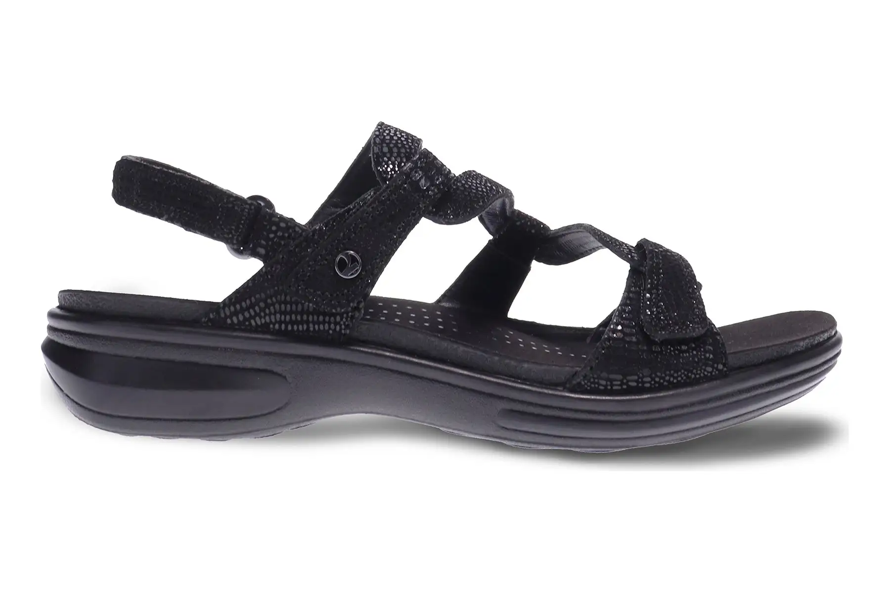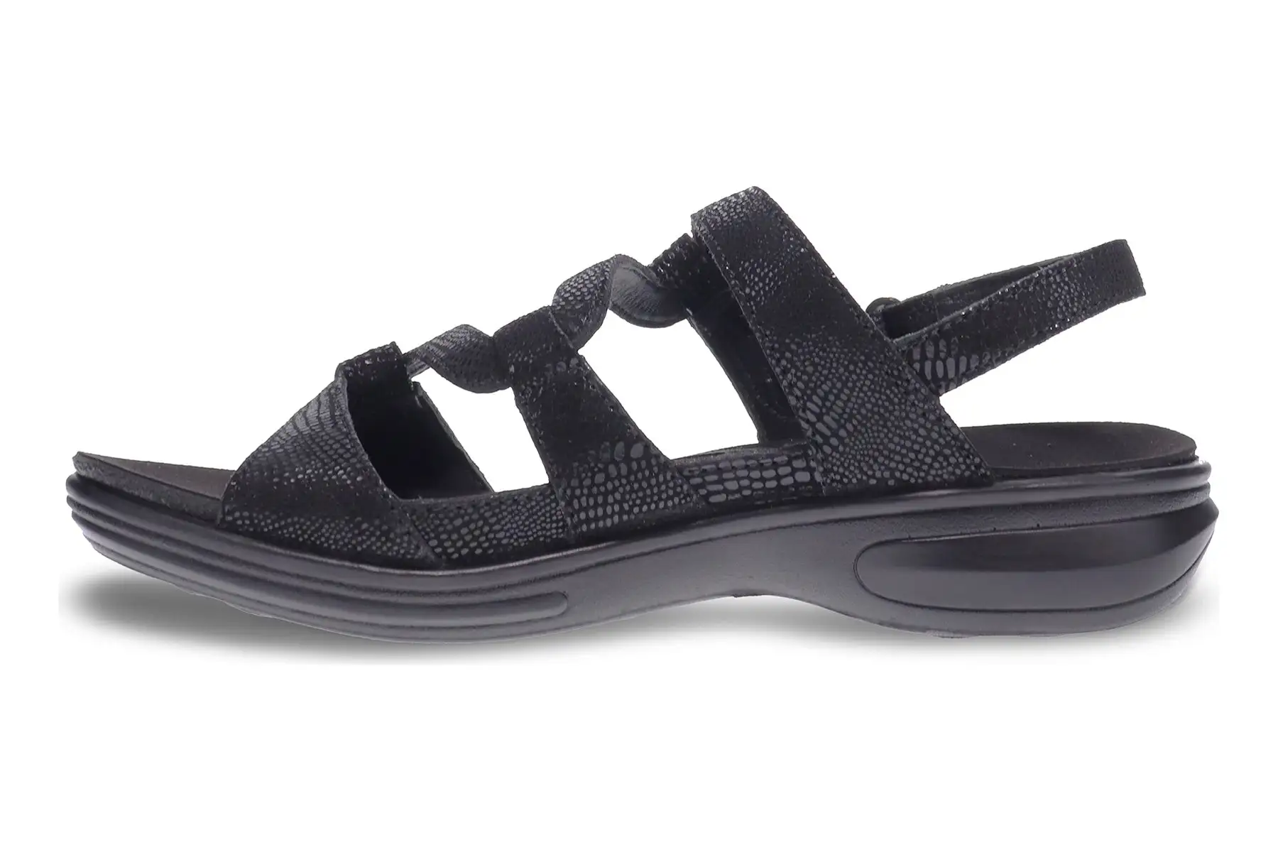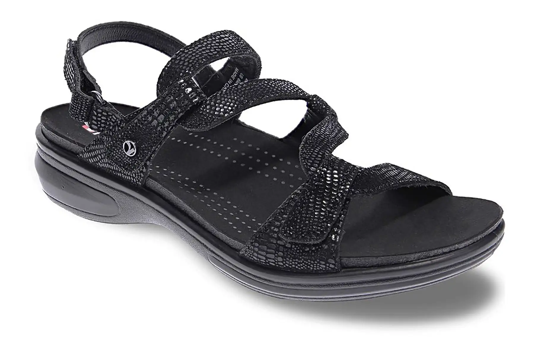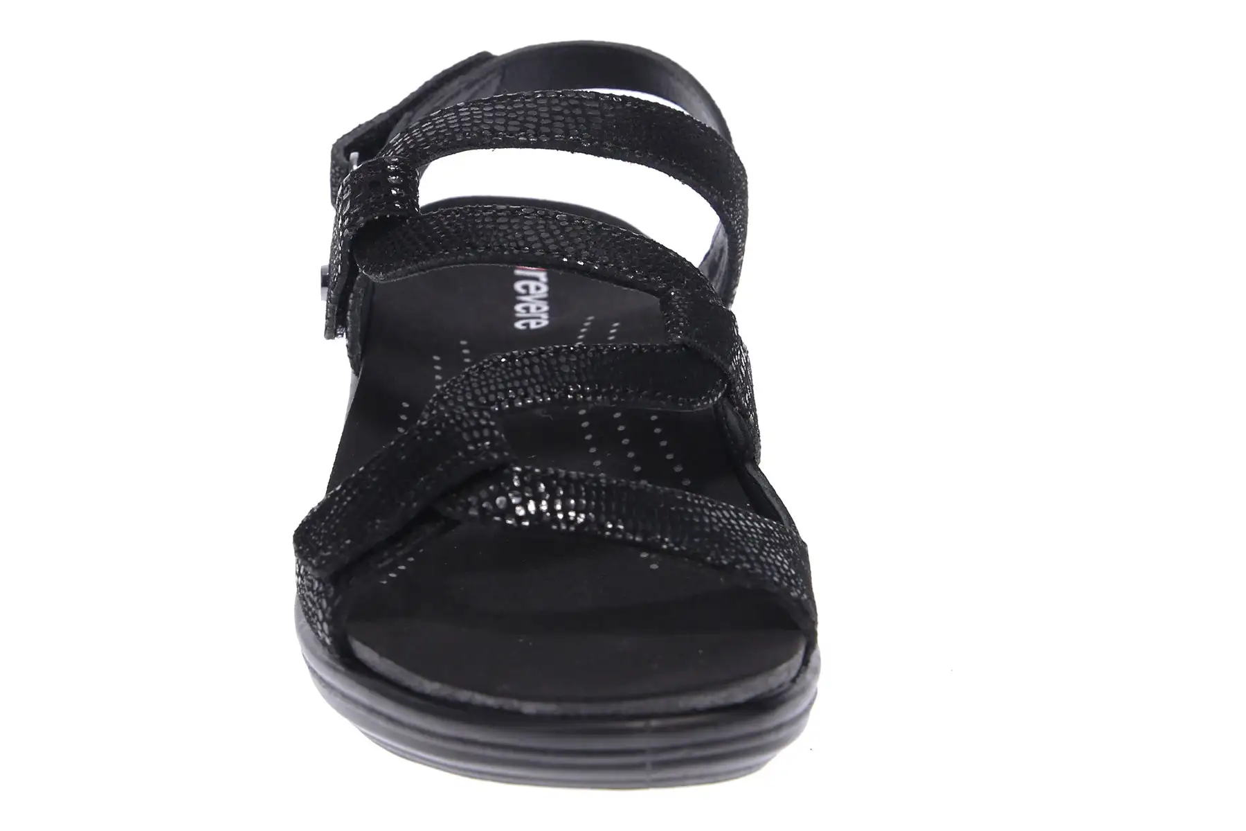 Revere Emerald is a comfortable and strappy warm weather sandal. Zigzagging adjustable straps, leather uppers and rubber outsole helps these sandals stand out. A removable comfort footbed, cushioned heel and deep heel cup outlines these fashionable shoes.