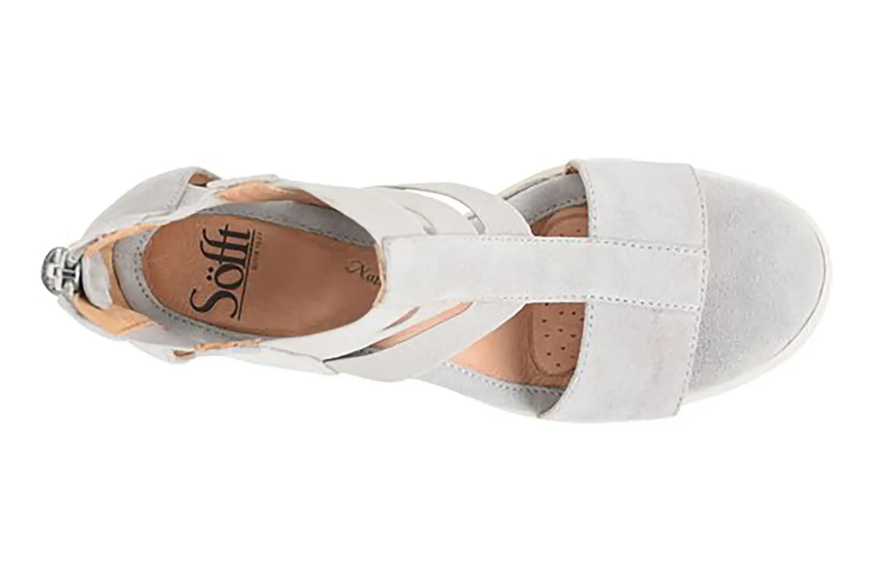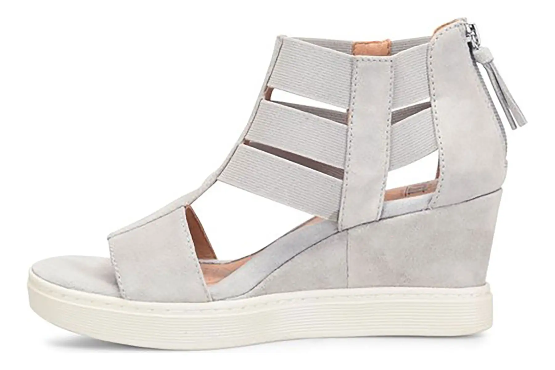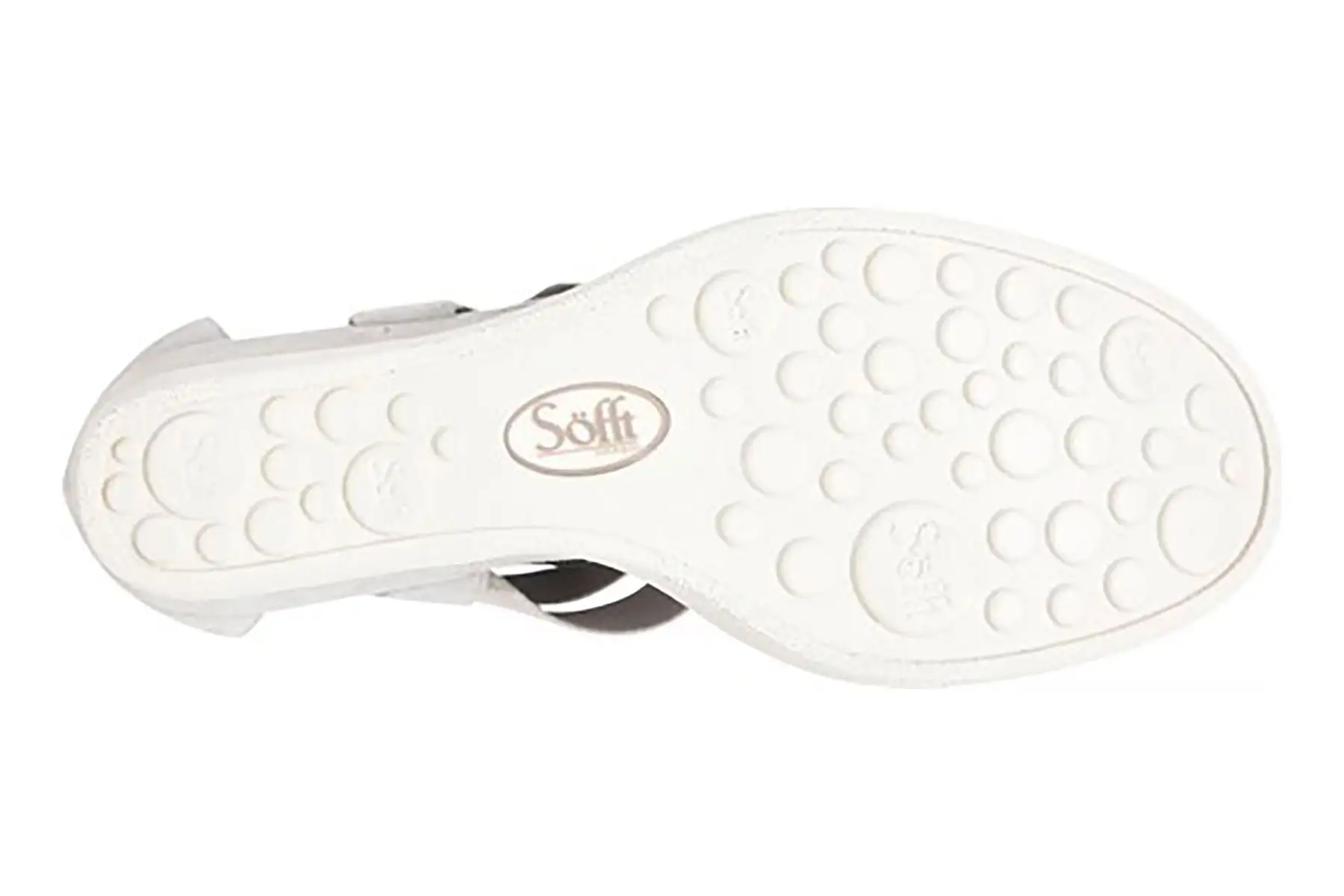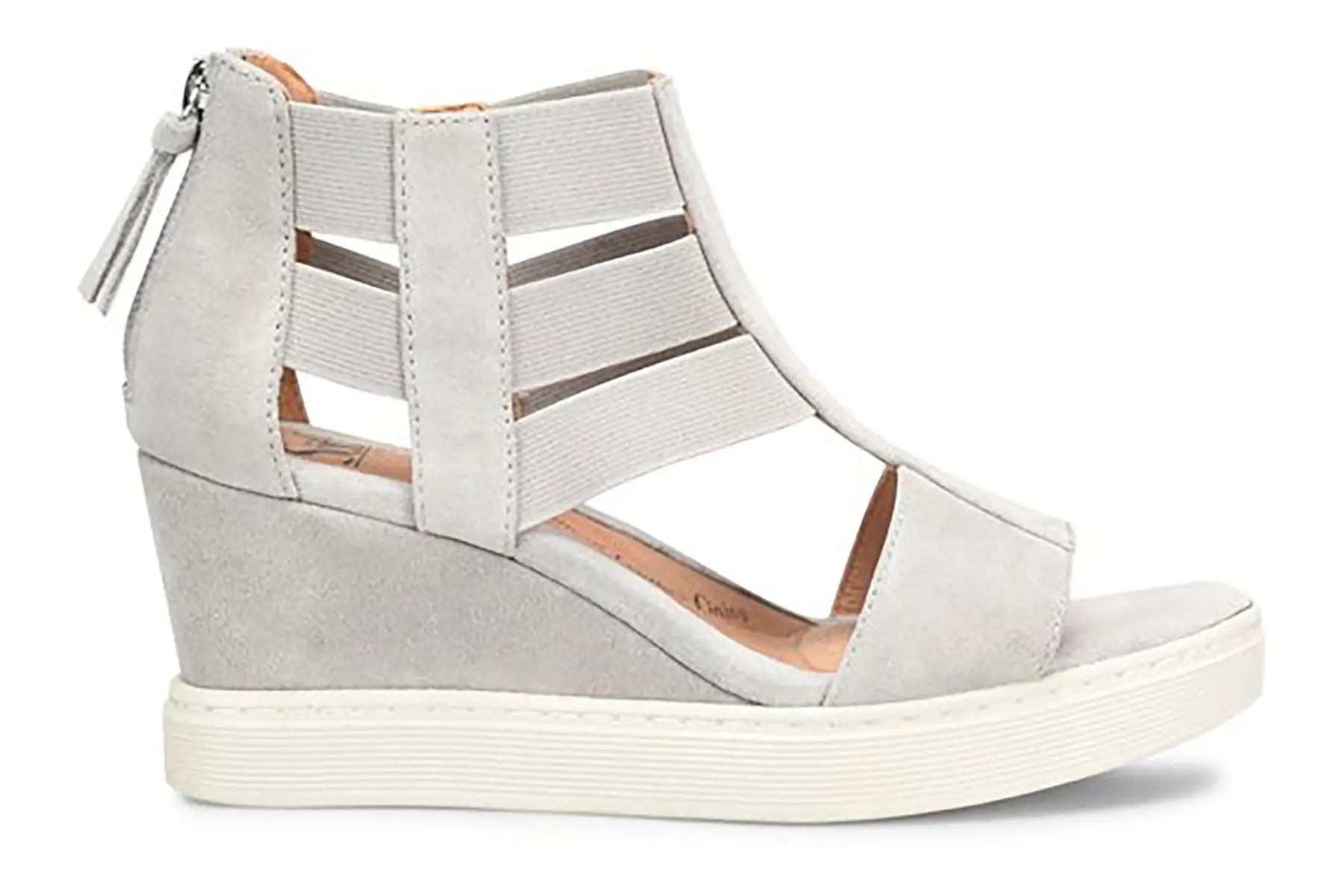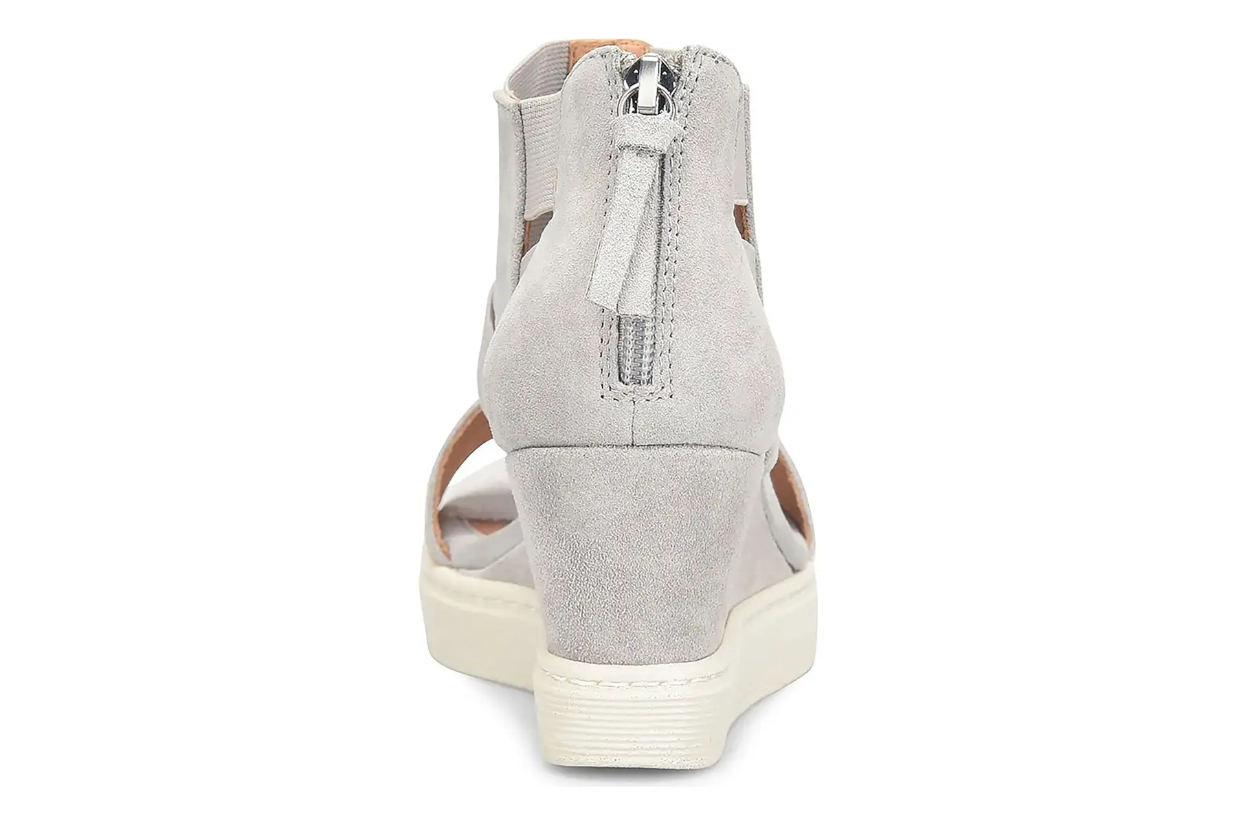 Sofft Sosie is a wedge sandal with a sporty sneaker style. These sandals have Italian leather uppers, back zipper, elastic straps and a lightweight PU outsole. A rounded open toe, elegant ankle straps and a 2 ¾ inch wedge heel makes these sandals ready for any occasion.