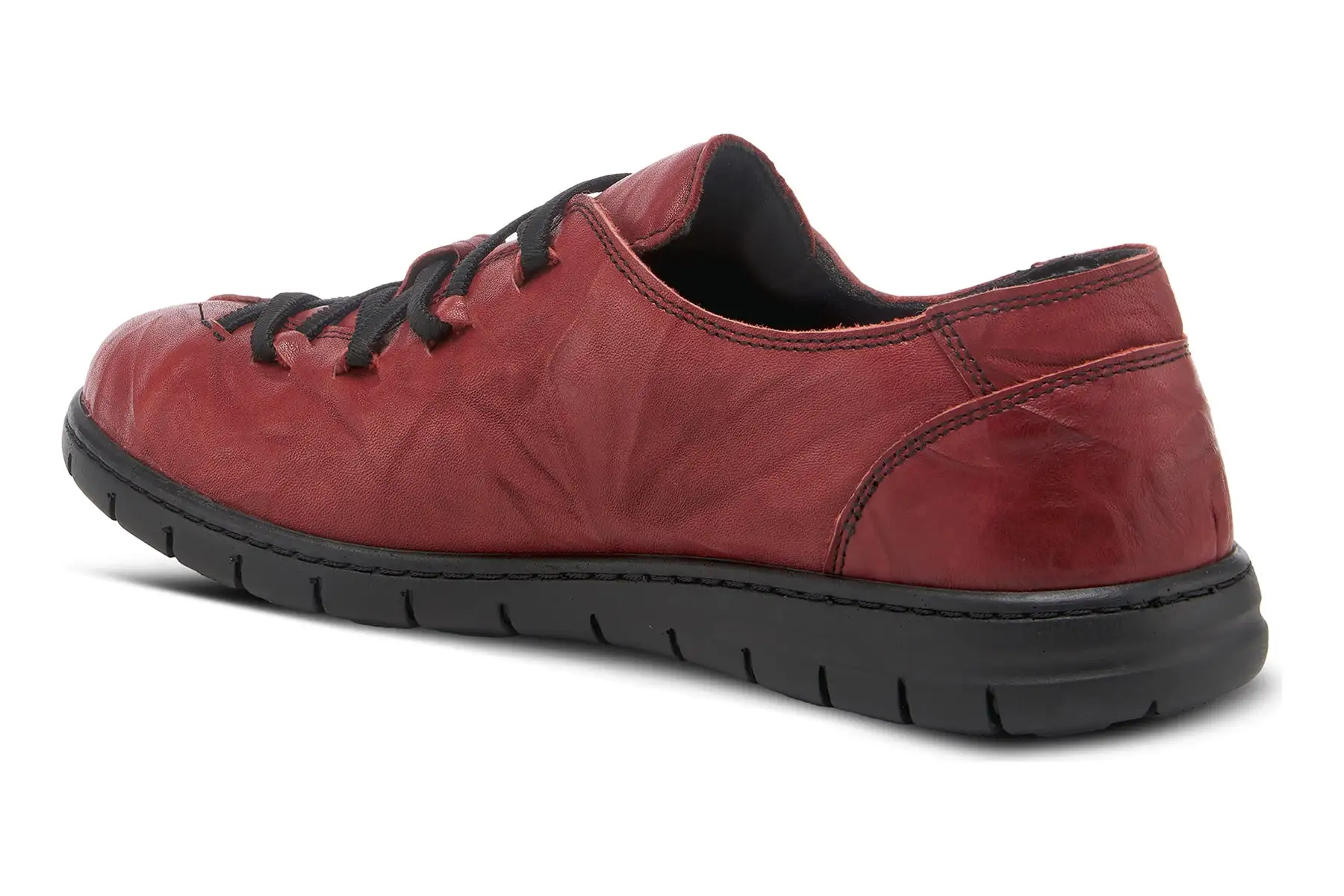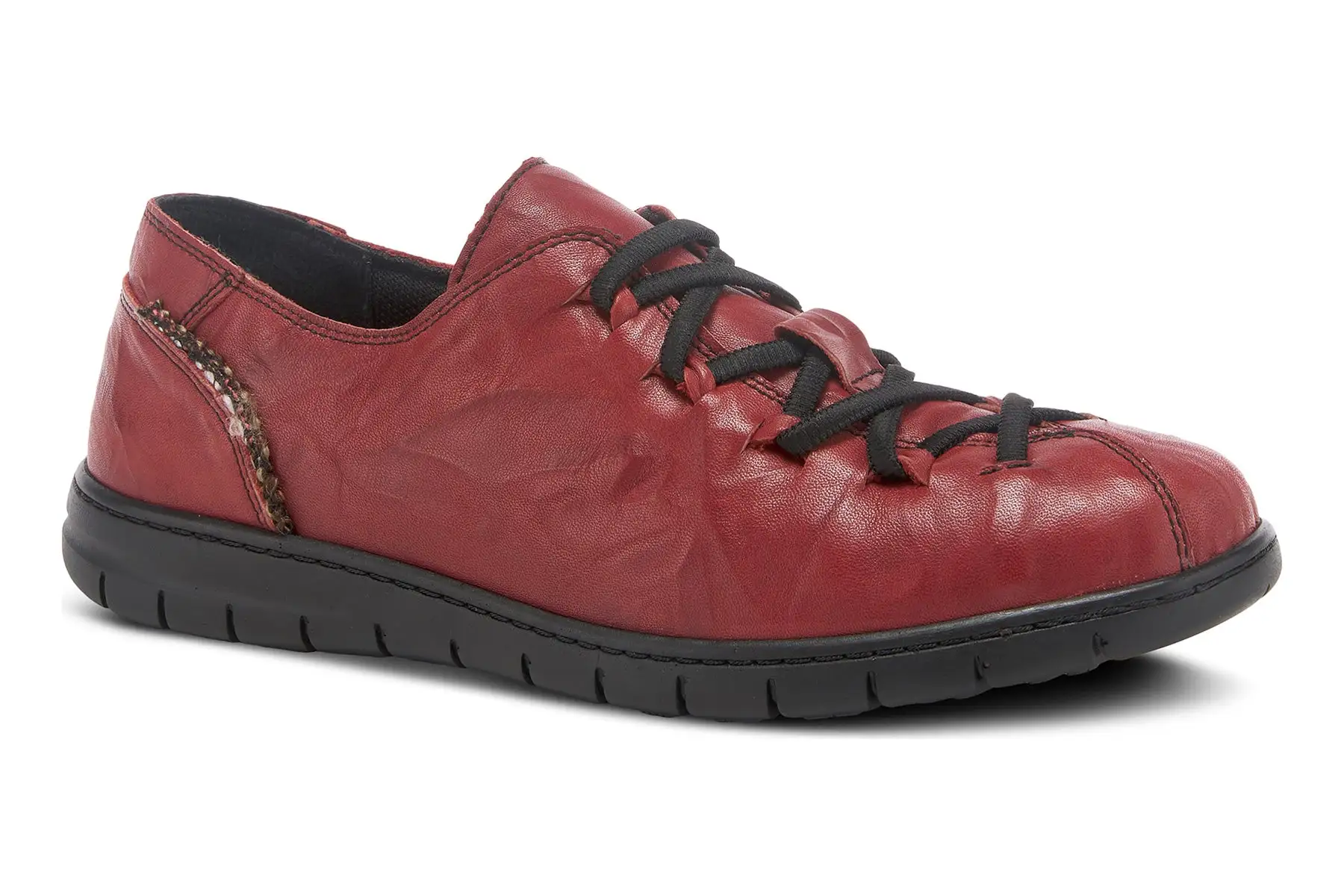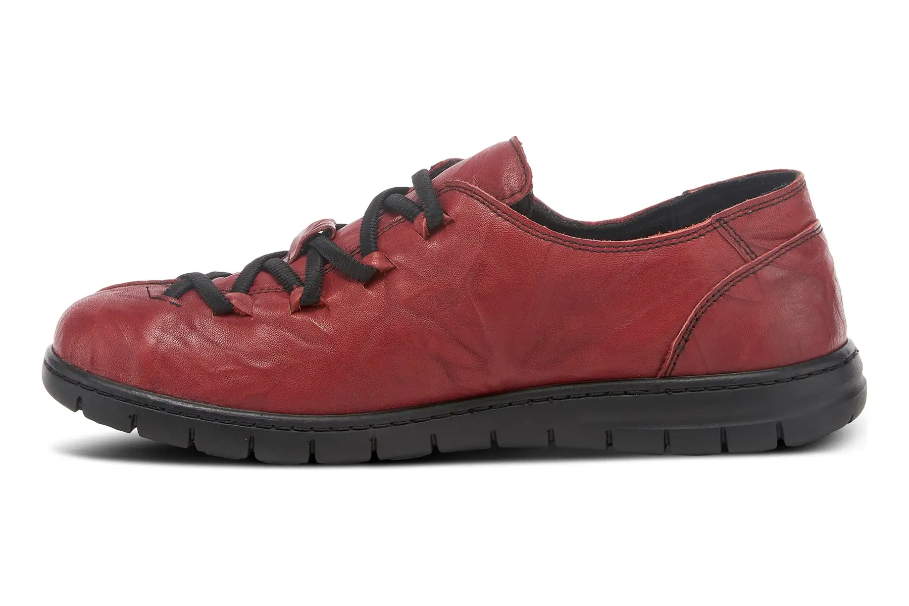Contemporary high-quality leather sneaker featuring an asymmetrical stitched toe, crinkled leather, and elastic laces on a polyurethane comfort and flexible sole.