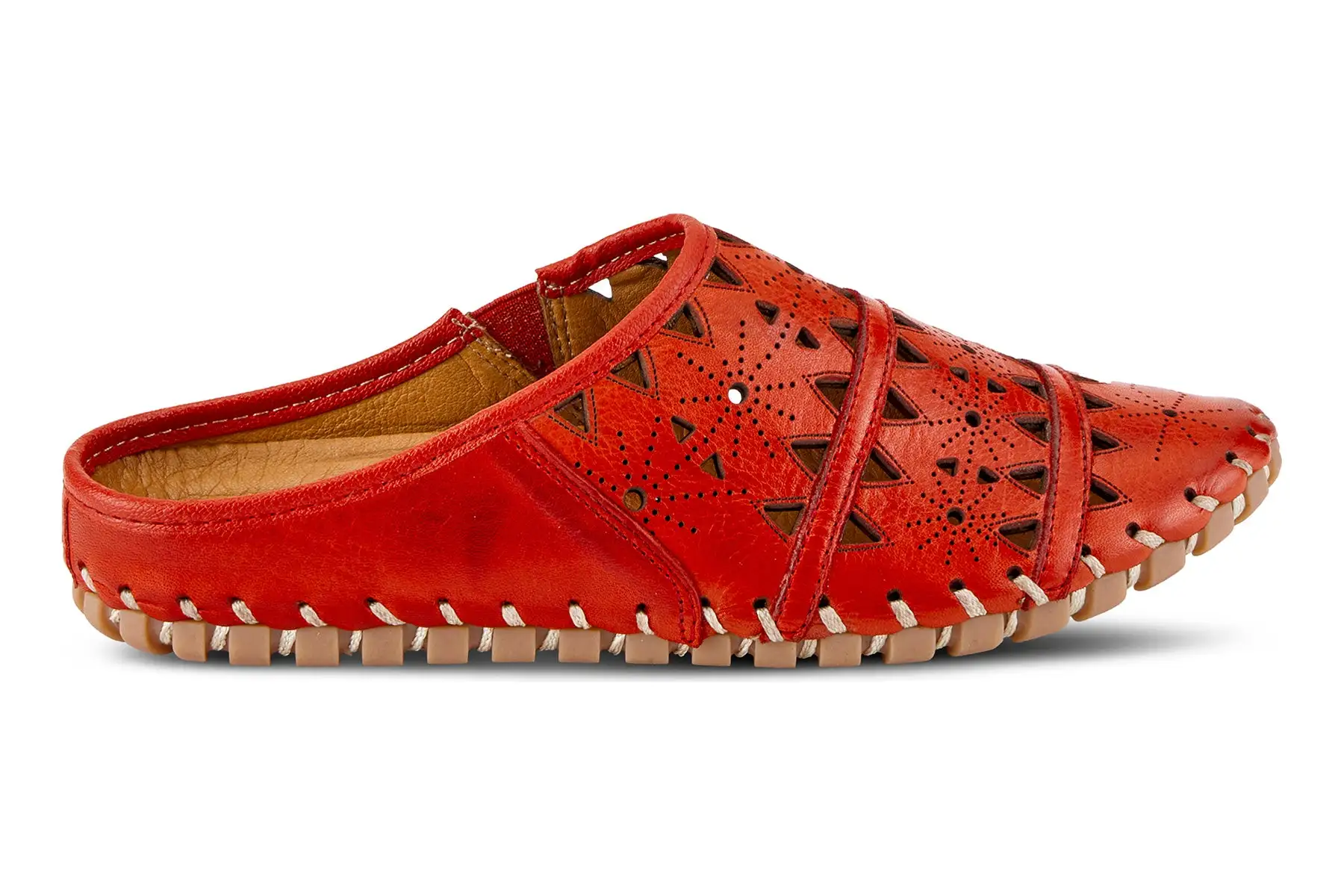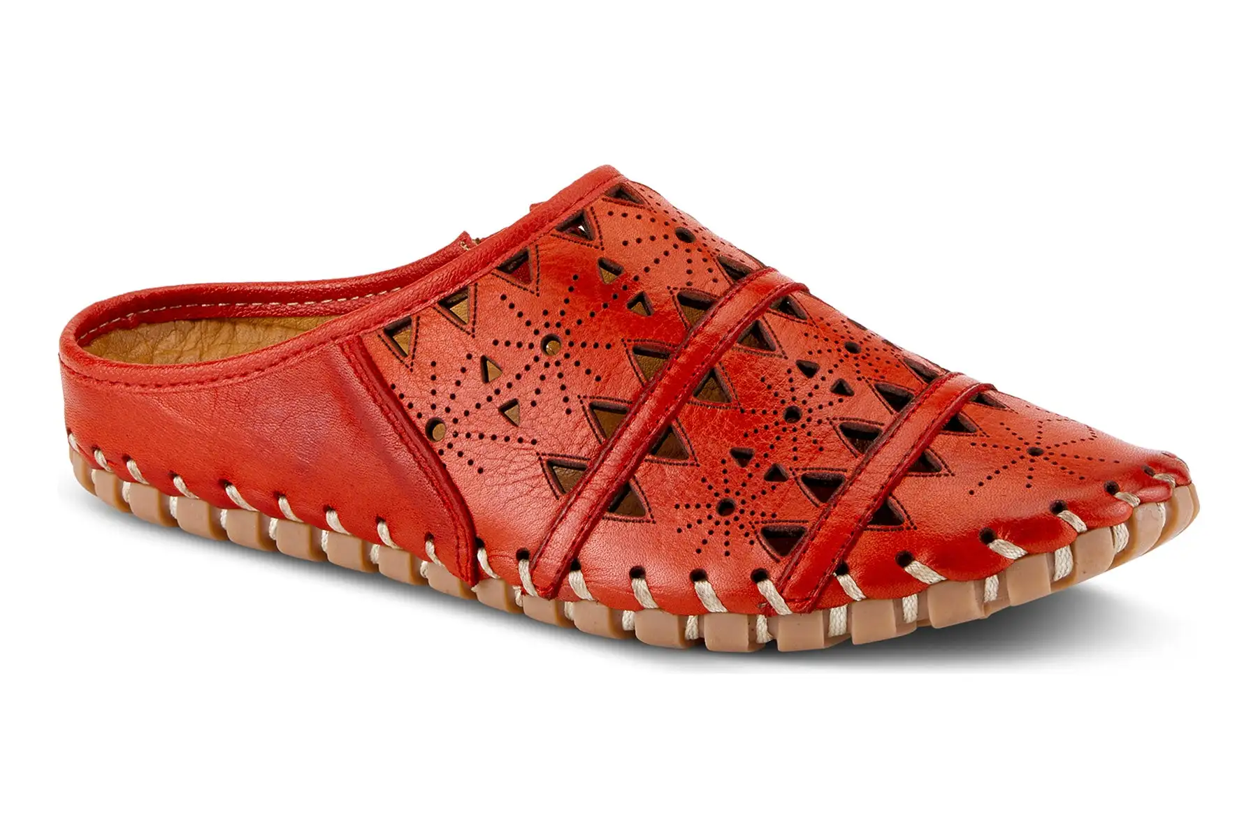 European-influenced, leather open-back slip-on shoe, featuring geometric laser cutouts and etching for a unique modern appeal all on a lightweight, durable, flexible, rubber sole for all-day comfort.