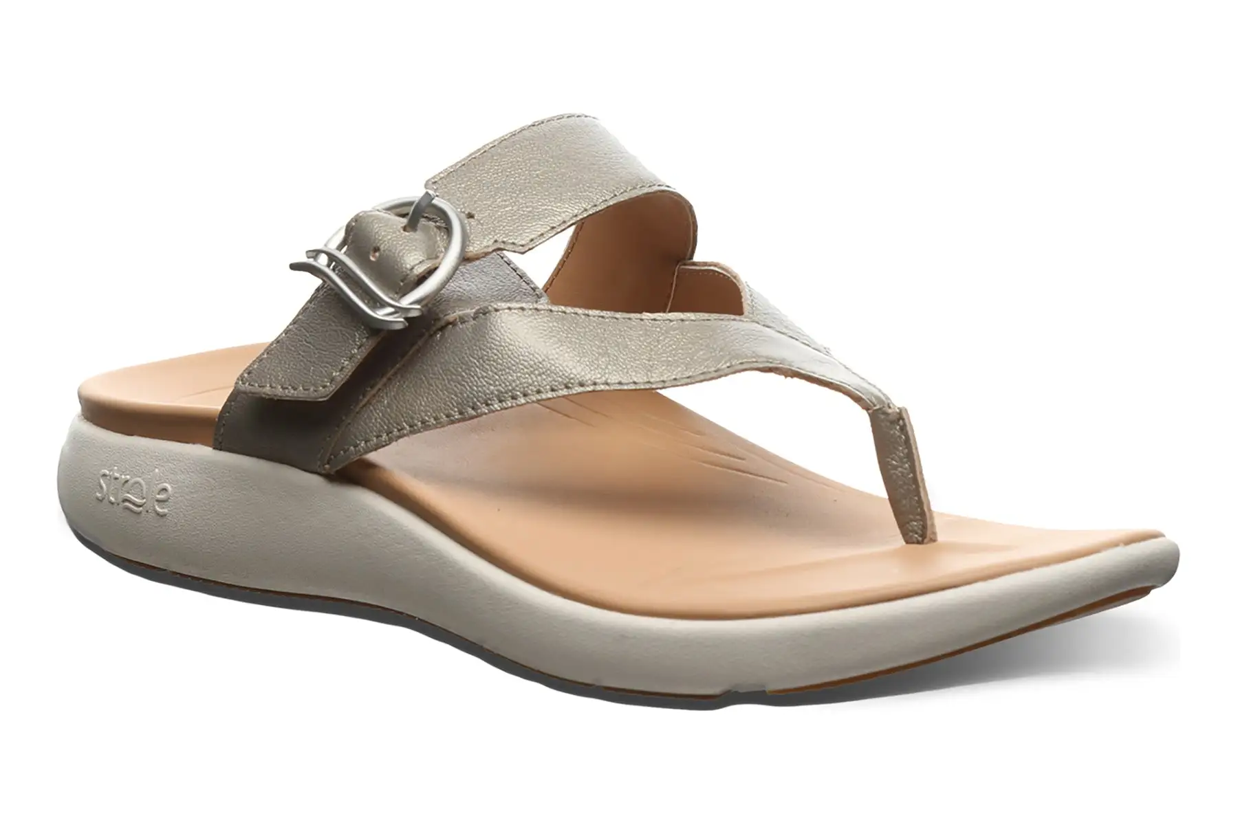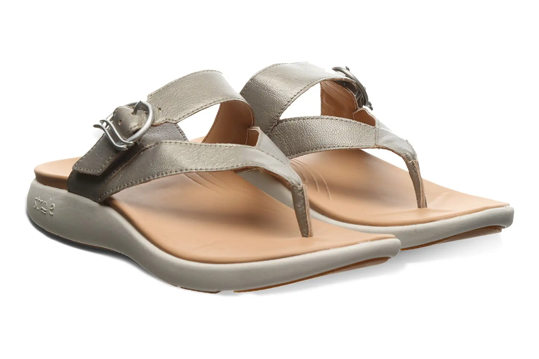 Strole Promenade is a supportive and comfy toe post sandal. These warm weather shoes have leather uppers, adjustable instep strap, toe post and EVA outsole. A sheep leather footbed offers added comfort, while a corrective uplift cradle support system provides arch support all day long.