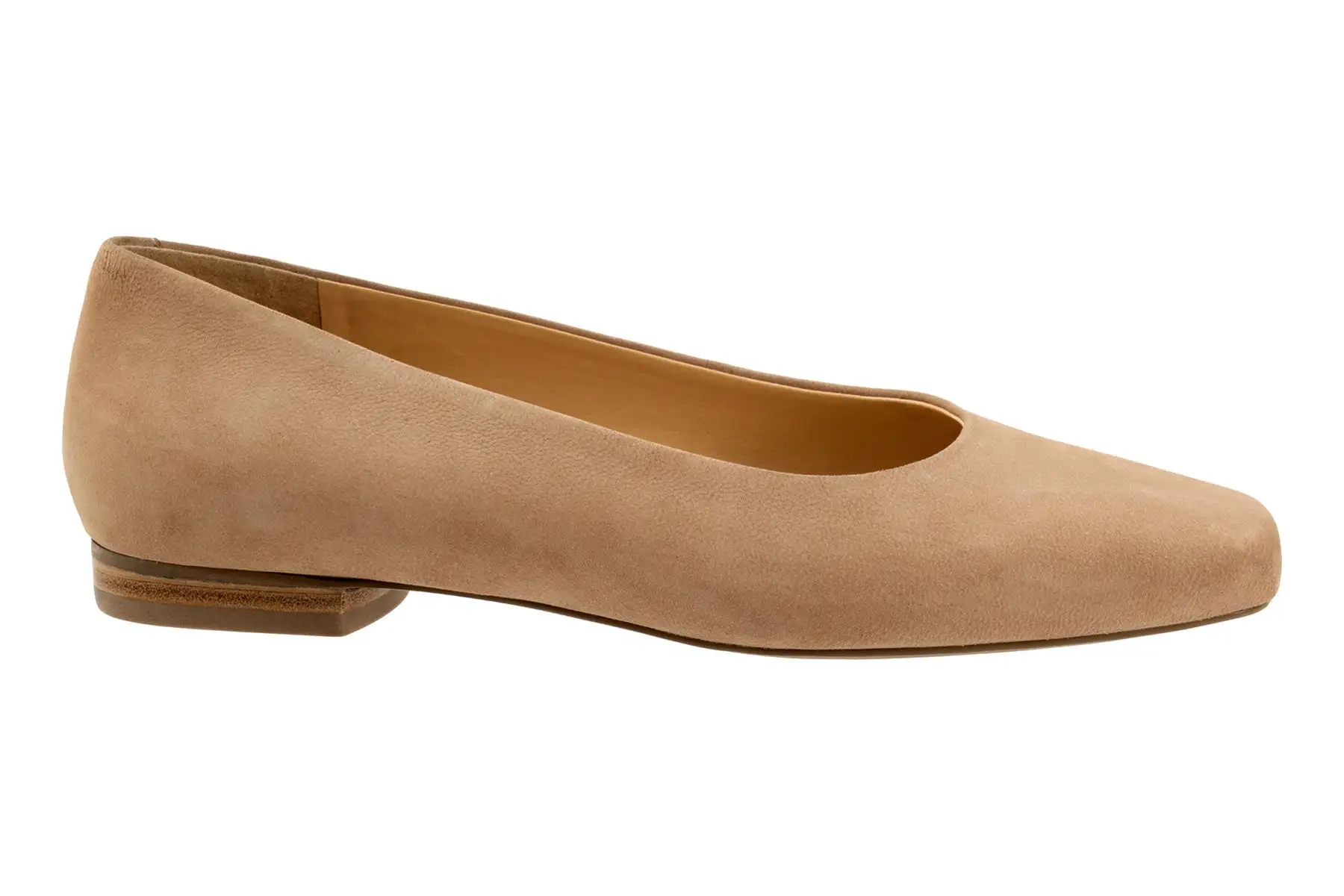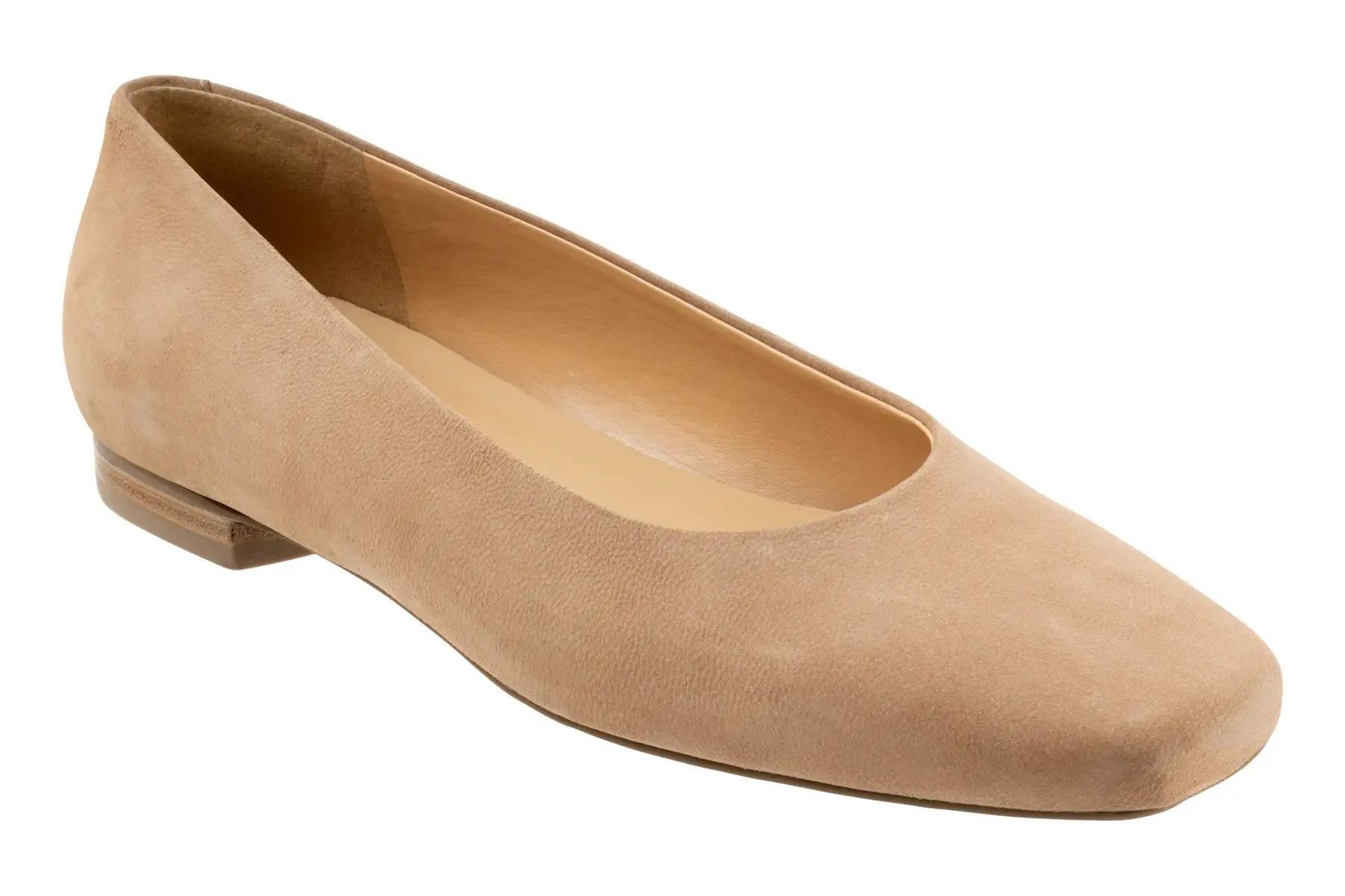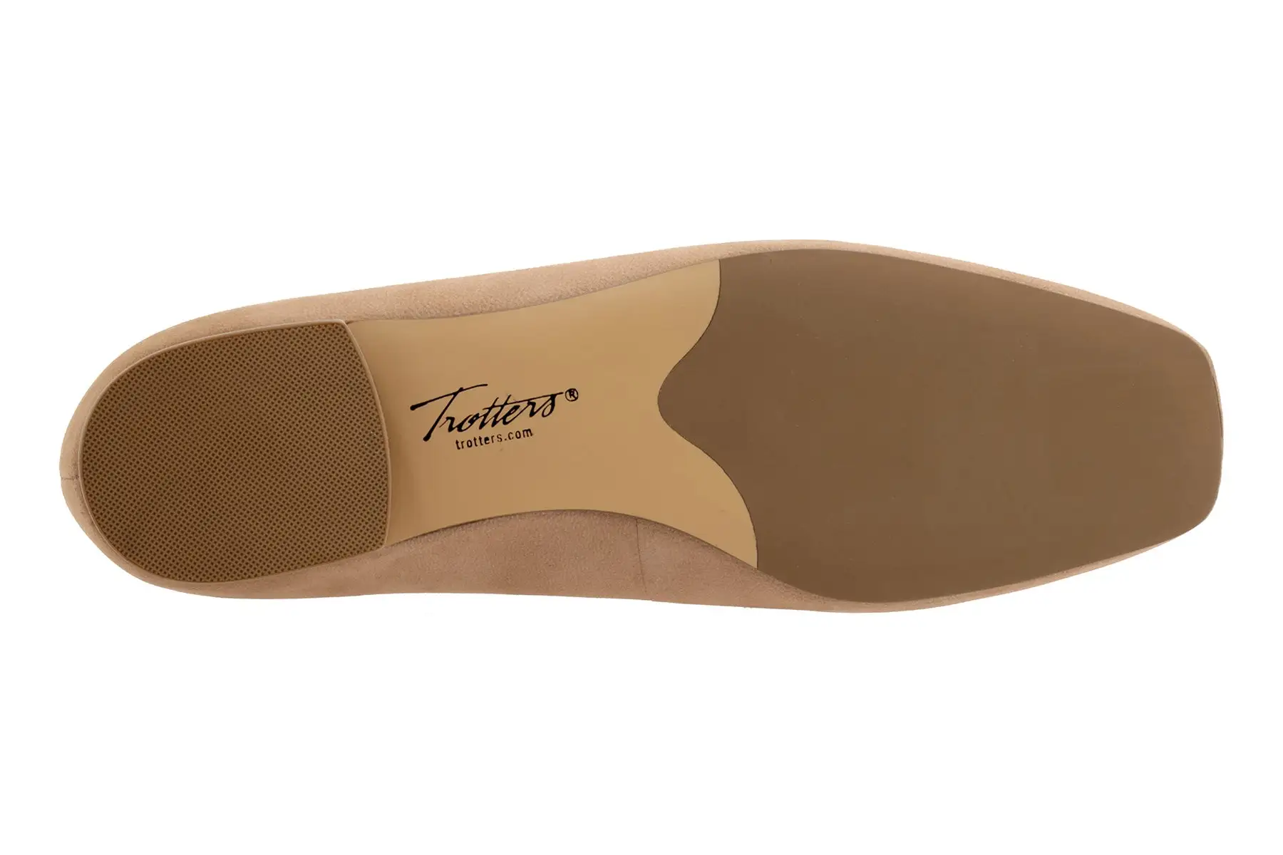 Trotters Honor is a modern cozy flat for many occasions. Features include leather uppers, removable EVA footbed, square toe and flexible rubber outsole. A soft rolled collar, low stacked heel and skimmer style will make these flats a new favorite.
